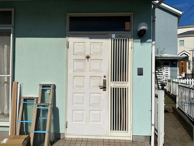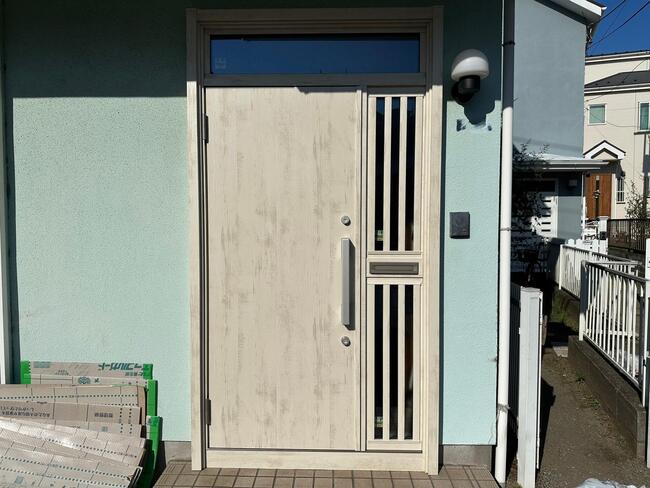 玄関ドアの調子が悪いということで、交換に至りました! 外壁の色が鮮やかなマリンブルーなので、ホワイトがすごく綺麗に映えますね! 元々の扉がポスト付きだったので、今回も同じ仕様にしました。 カギ穴が2つあるので、防犯対策もしっかり出来ています!!