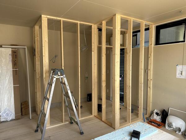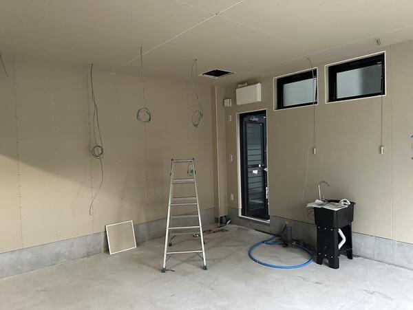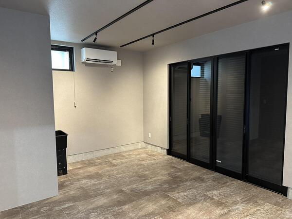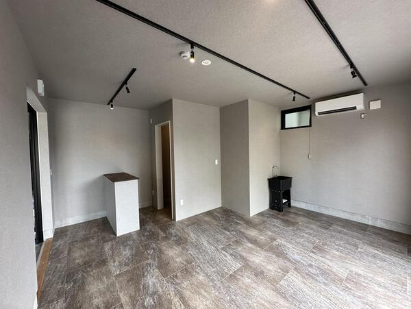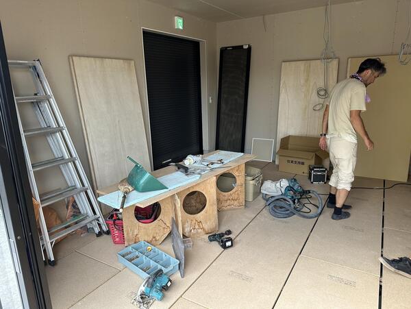 床は3mm厚のフロアタイルで動きのある模様のモダンな感じにして、
