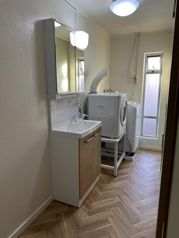 洗面室と廊下の組み合わせをもっと有効活用したいということで、 配管の移設と設置個所の移設を行いました、その際カベとユカを綺麗にイメージを変えました!既存が白い壁だったので、塗りなおして艶有りの白で塗り、 床はオーク調のヘリンボーン柄で奥行きと動きのある、空間に仕上がりました。