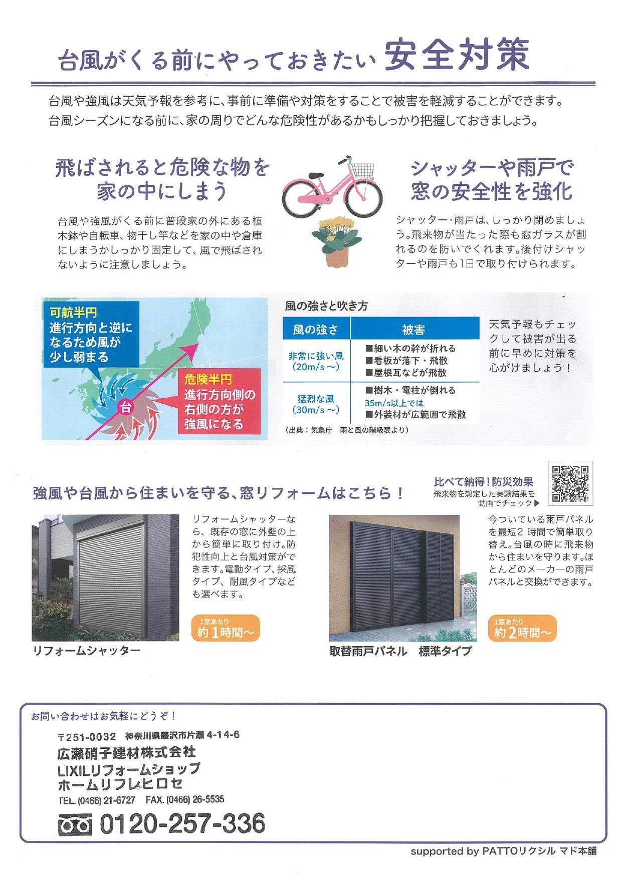 先日の大型台風情報を聞いて、あわててご連絡をいただいたのですが、発生してからでは間に合いません。やはり事前にしっかりと備えることが大事です。