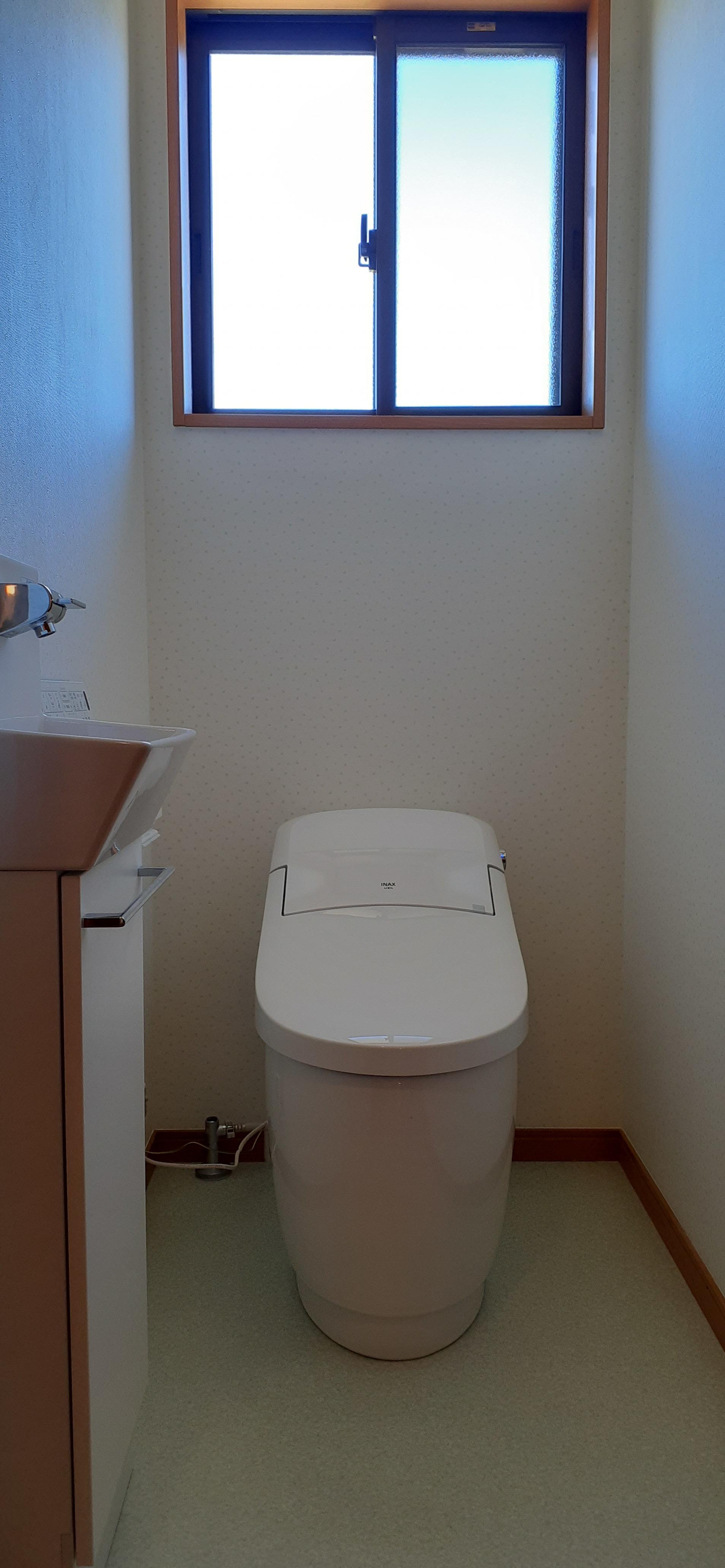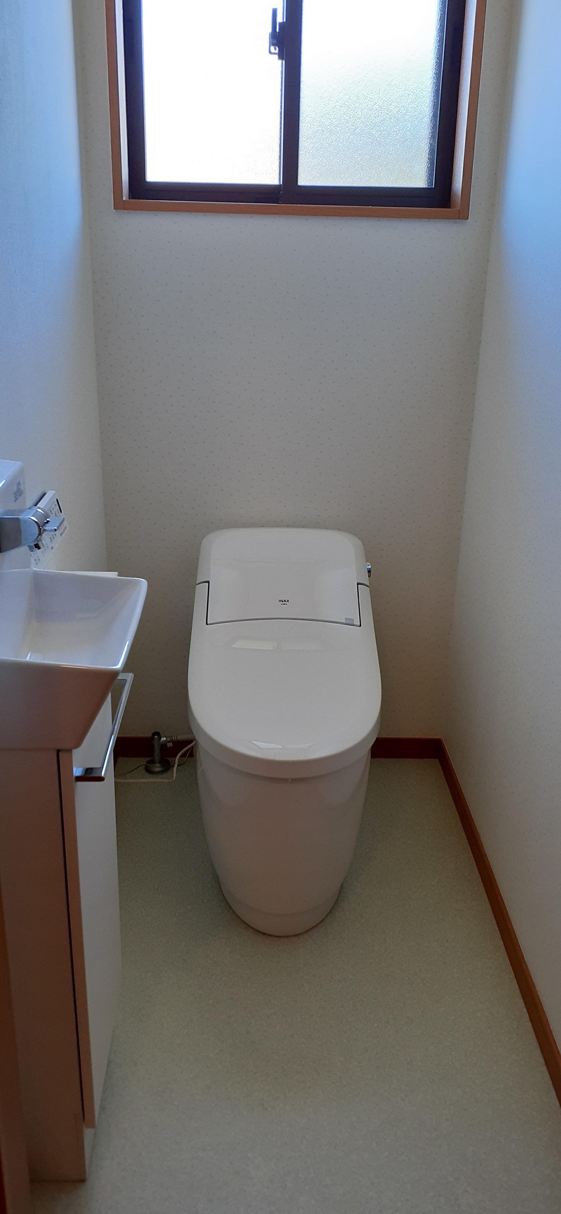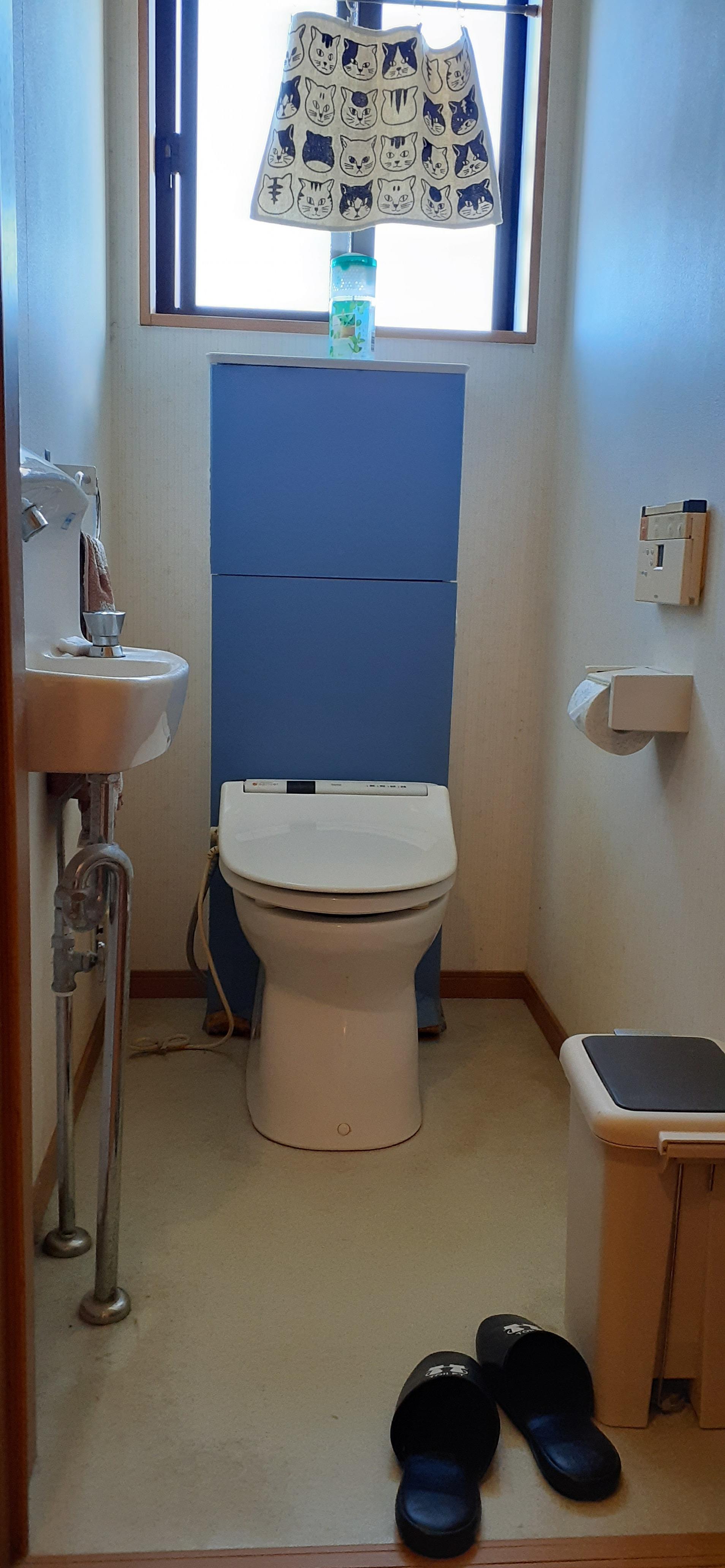 トイレ改修工事をさせていただきました。 今までのトイレの背面についていた収納。 こちらも撤去をし、新たに手洗いと収納が一体となったものをご採用されました。 トイレも新しくなり、トイレ背面もスッキリとしました。 トイレ空間全体が広く明るい空間になりました。
