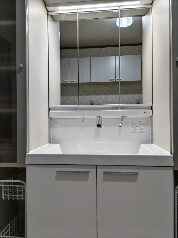 併せて、洗面改修もさせていただきました。既存の両脇にあるトールキャビネットはそのままお使いになられるとのことで、洗面化粧台の交換をしました。タッチレス水栓をご希望され、トールキャビネットとの相性も抜群です。