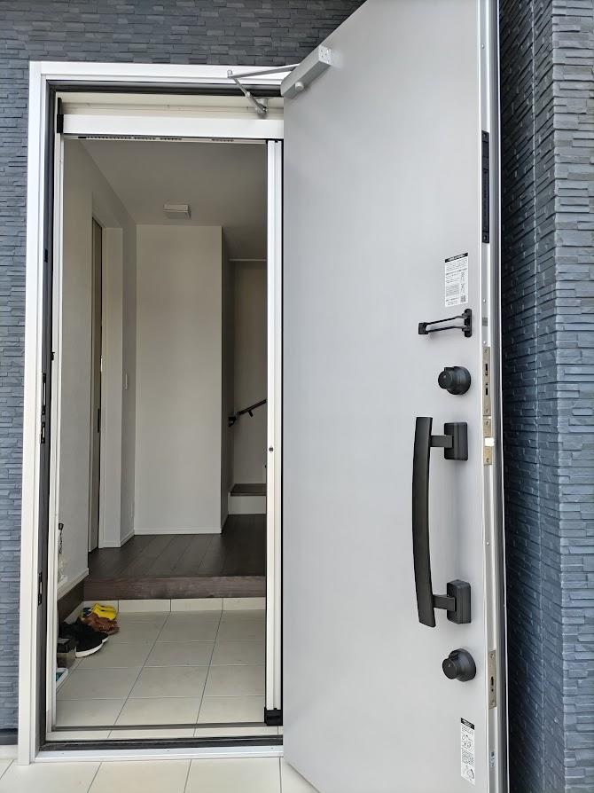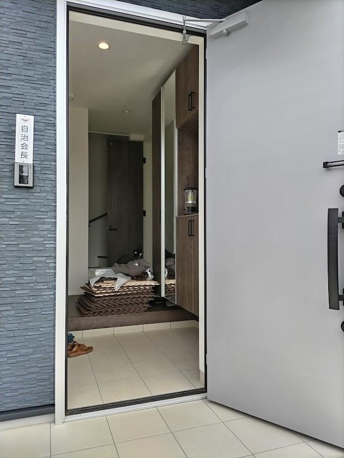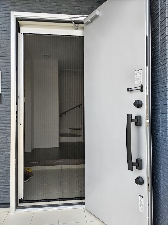 玄関網戸の取付工事をさせていただきました。 玄関からの風を取り込みたいとのご希望があり、玄関網戸「しまえるんです」を取り付けました。 網戸部分が折りたたまれ、スッキリと収納できます。 網戸本体は簡単に取外しができ、丸洗いもできます。清潔に保てますね。 かんたんリフォームで快適空間に早変わりです。