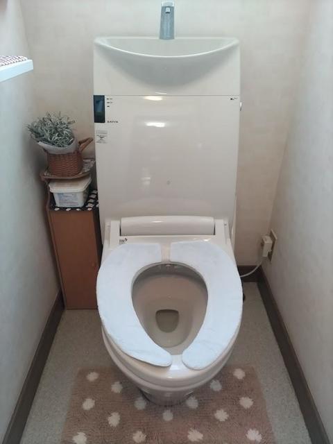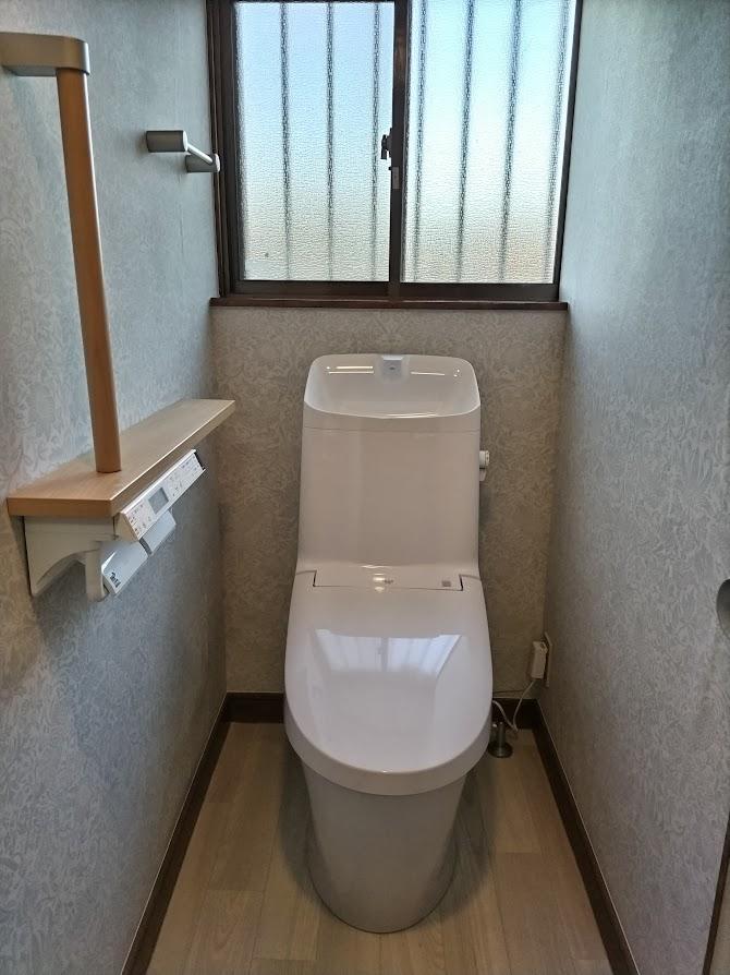 商品を調べてみると、部品供給が終了しているとの事。それならば、トイレごと取り替えて併せて床のクッションフロアと壁のクロスも施工をとご採用いただきました。クッションフロアは明るい色の木目を選ばれ、壁のクロスは薄いグレーを選ばれ、明るく落ち着いた雰囲気の空間になりました。
