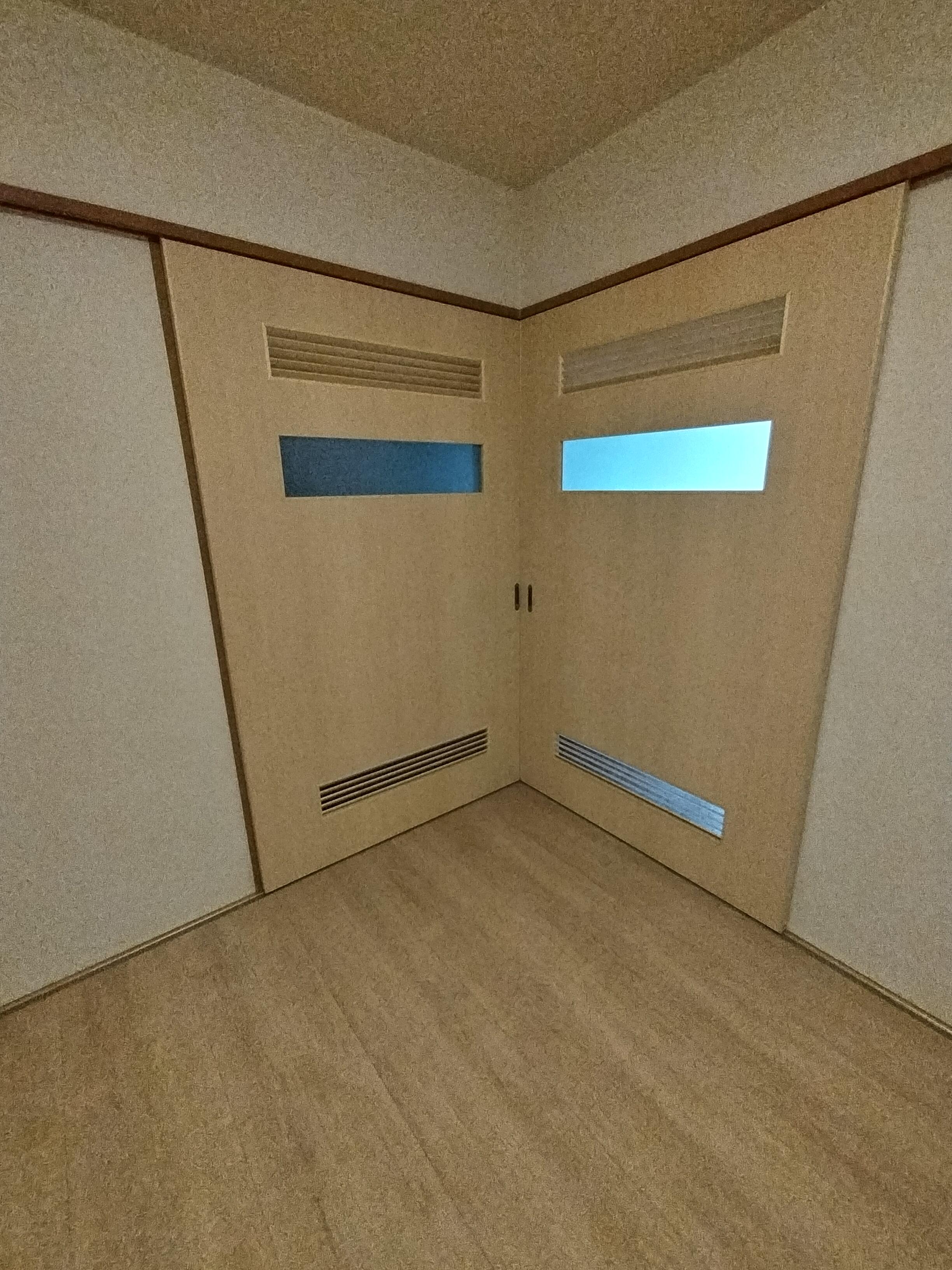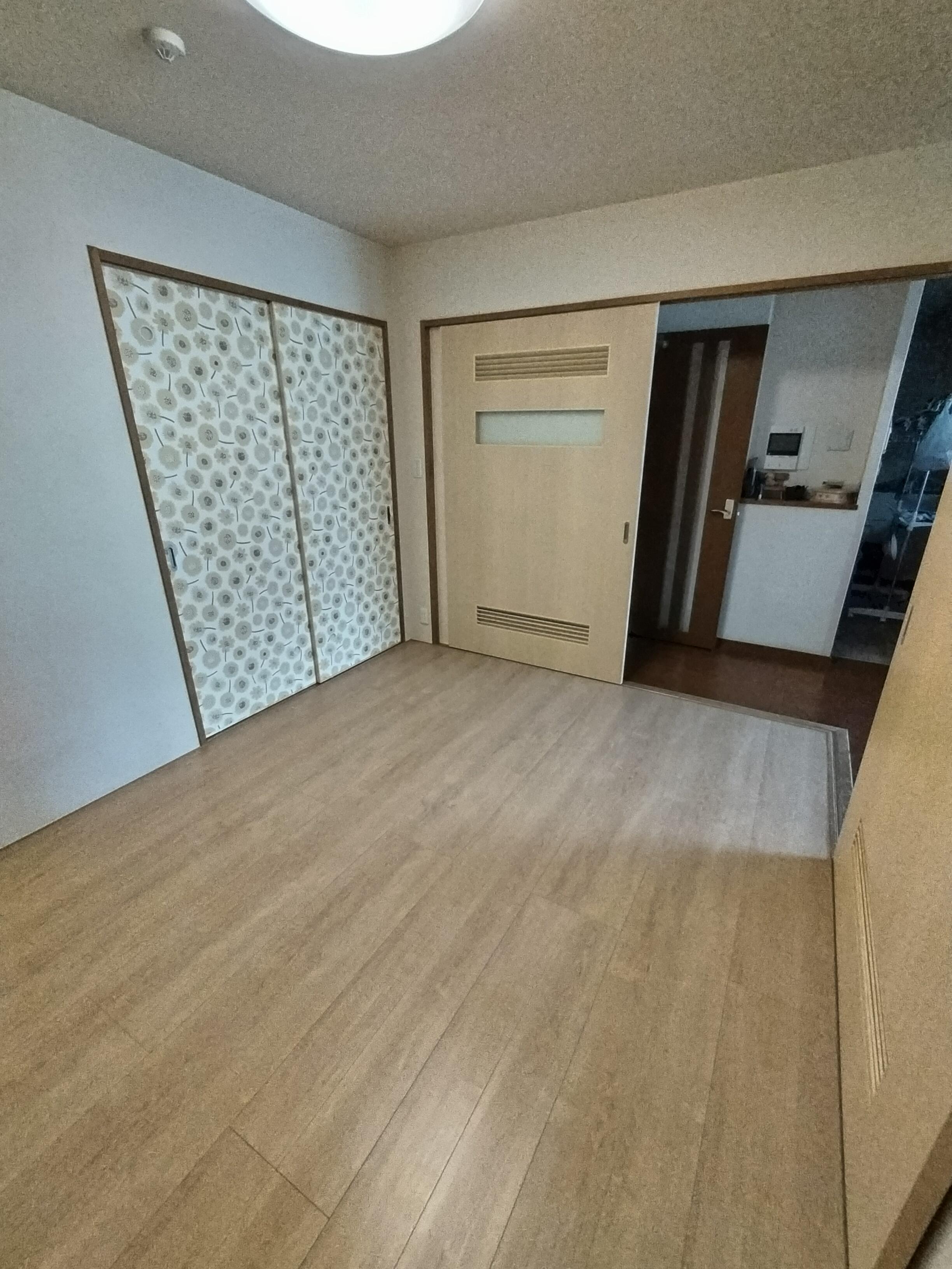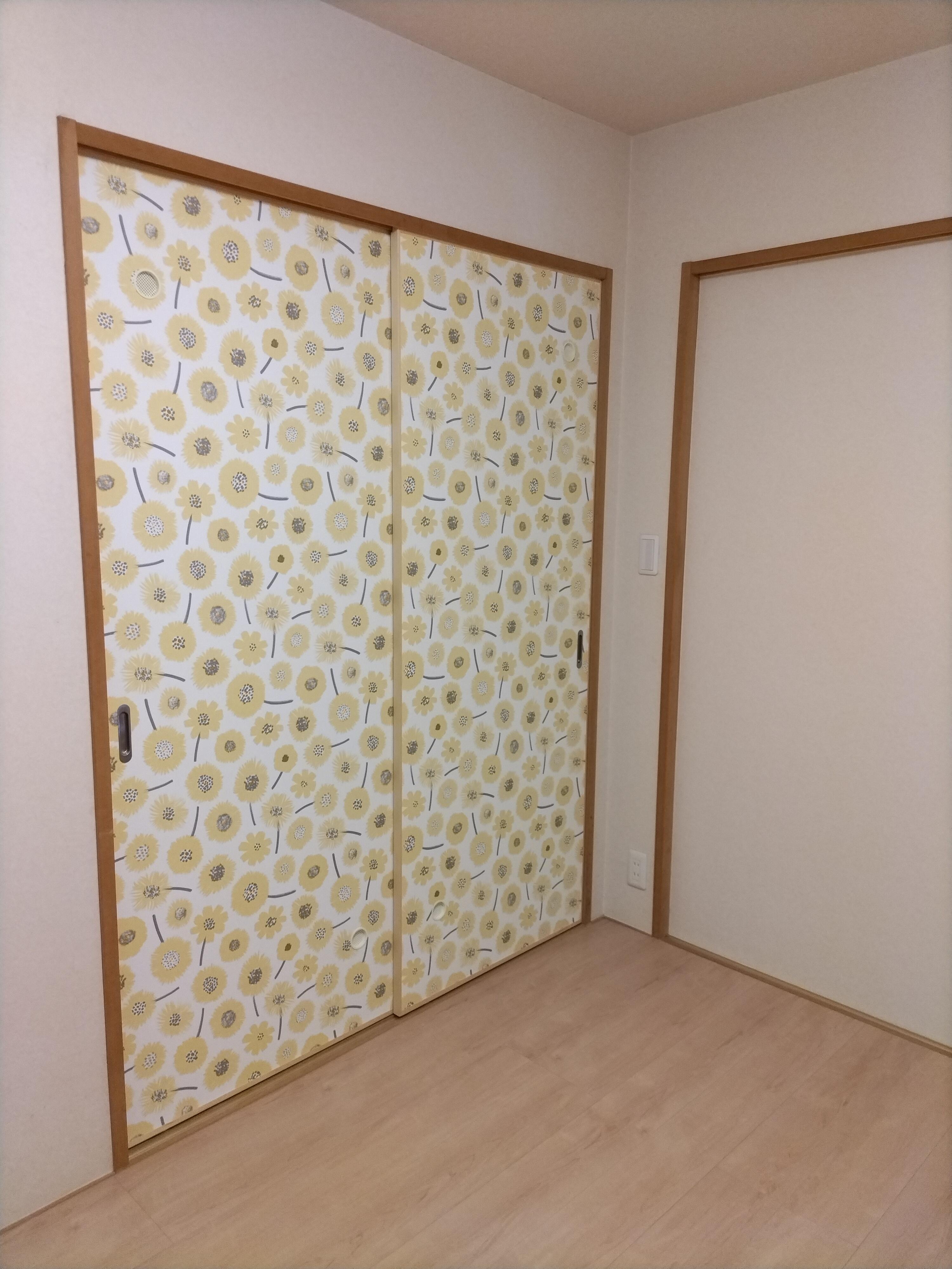 和室から洋室への改修工事のご相談をいただきました。 和室の畳をフローリングへ…。 そして、押入れ襖と出入口襖を新調しました。 襖は、開け閉めの動きが悪くなっていたので思い切って新調! 出入口襖はデザインを考え片引き戸へ、押入れ襖にはクロスを施工。 奥様が悩みに悩まれ、お気に入りのクロスに決定!!! お部屋のアクセントになりました。