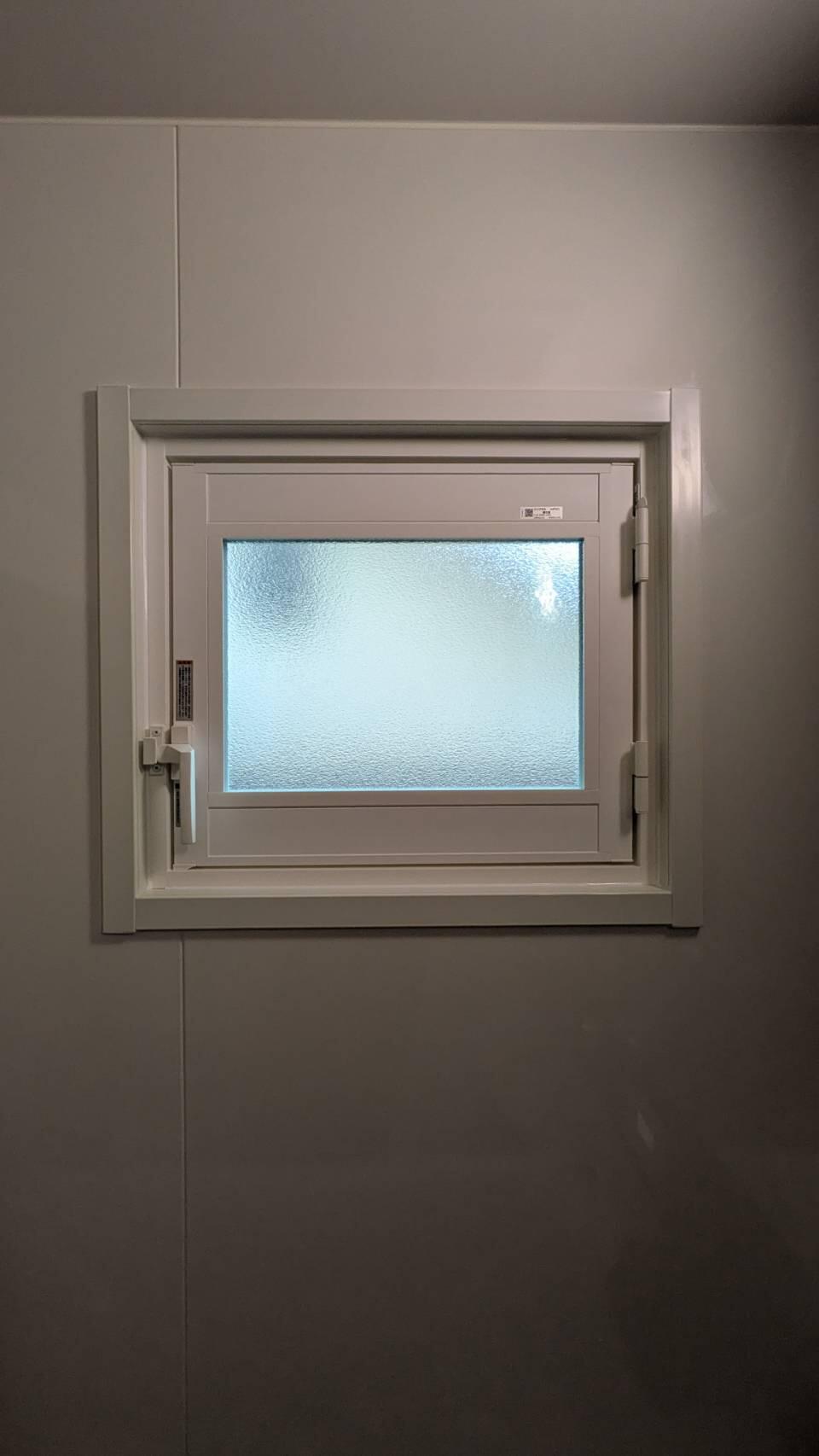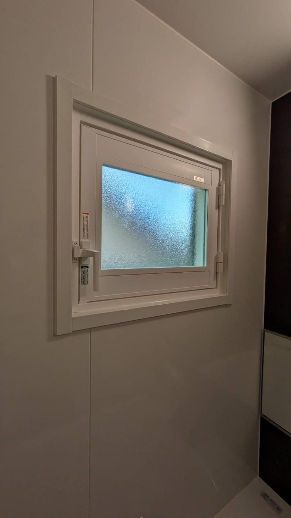 お風呂の窓には開き窓でクレセントが折りたためる仕様なので、開き窓のユニットバス納まりをご採用。