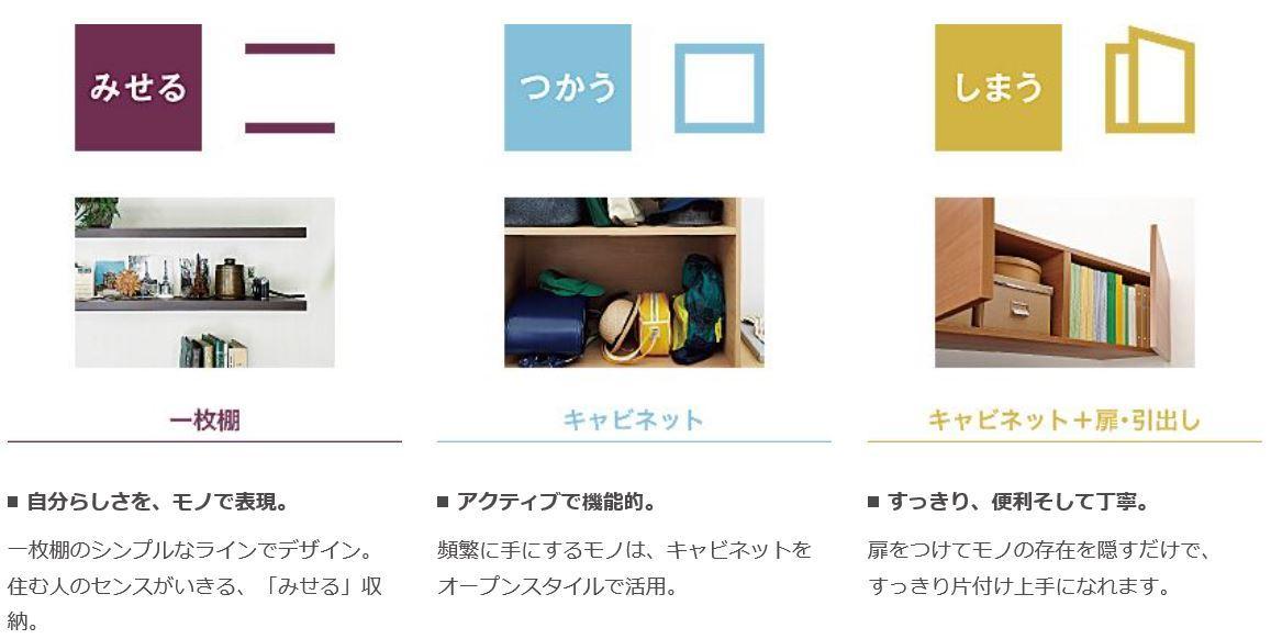 Vietasは、住まい全体の収納を「モノ-ライフバランス」の考え方をベースに、「みせる」「つかう」「しまう」の3つのカタチで考えます。