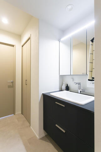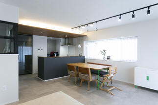 水まわりは脱衣室と洗面室を分離し、キッチンも廊下からの動線を確保。内装はブラックフレームのドアや間接照明でスタイリッシュに仕上げています。さらに内窓設置で断熱性を向上し、補助金申請にも対応しました。