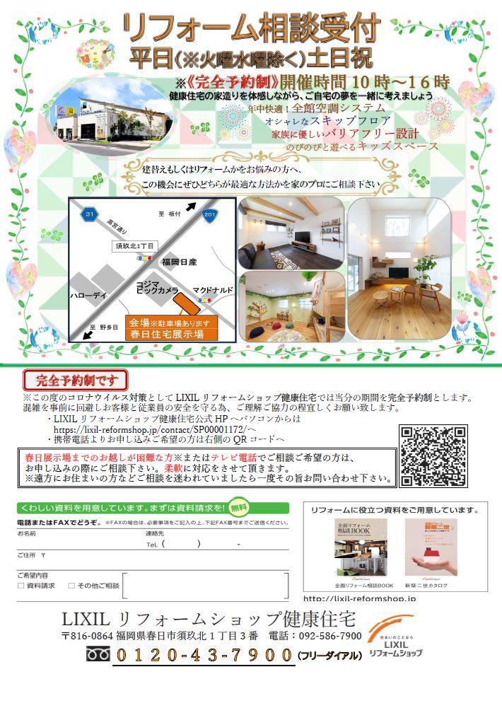 この度のコロナウイルス対策としてLIXIL リフォームショップ健康住宅では当分の期間を完全予約制とします。