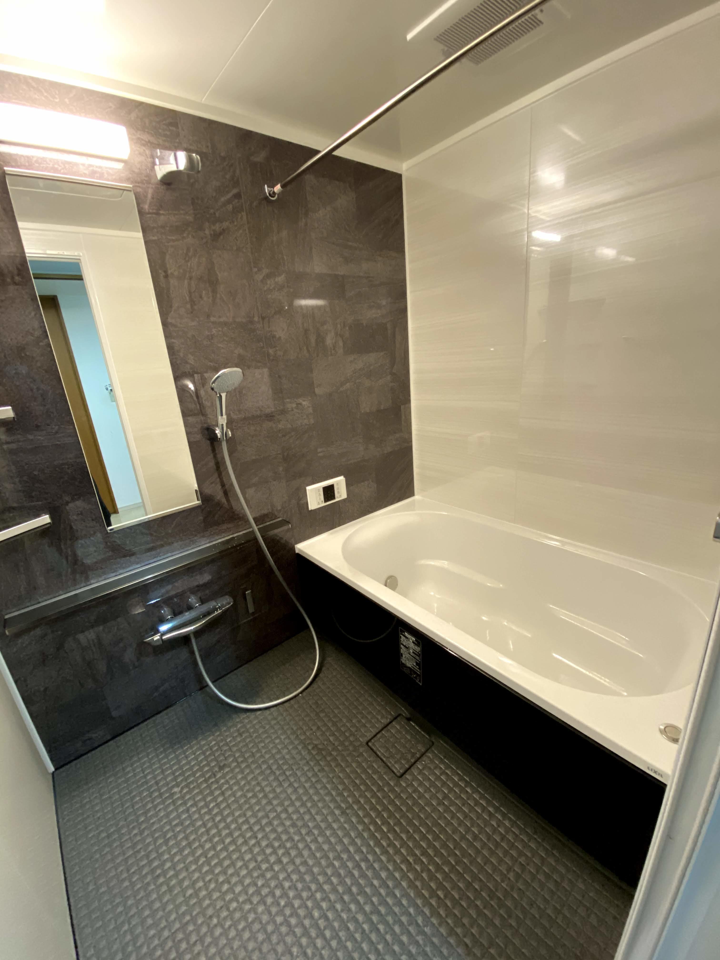 LIXILリノビオシリーズ お手入れのしやすさに加え、段差解消によるバリアフリー化、また、シックな色合いの落ち着いた空間で快適なバスルームに なりました。