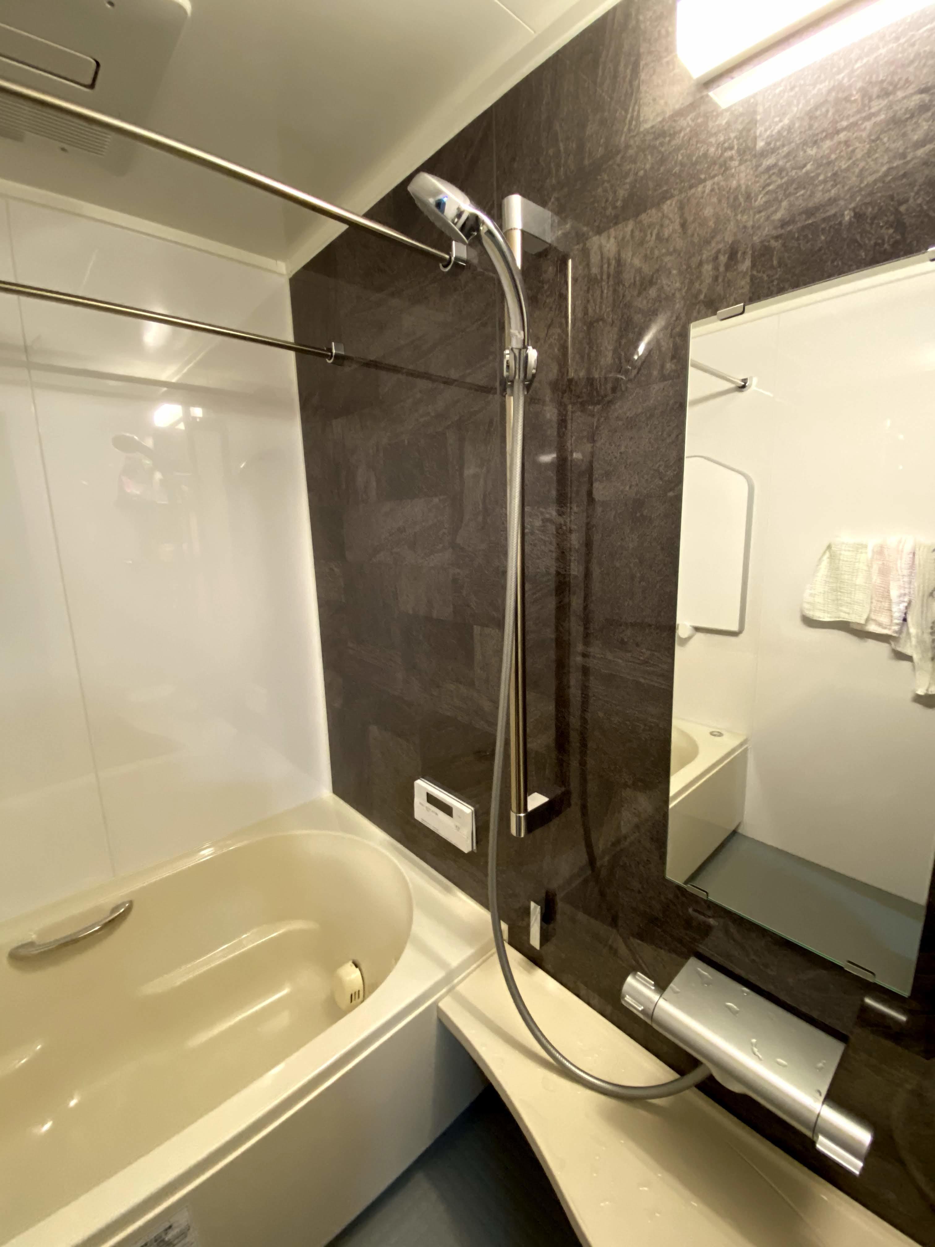 LIXILリノビオVシリーズ シックで落ち着いた雰囲気であり、お手入れのしやすさや節水シャワーヘッド、段差解消もなされています。