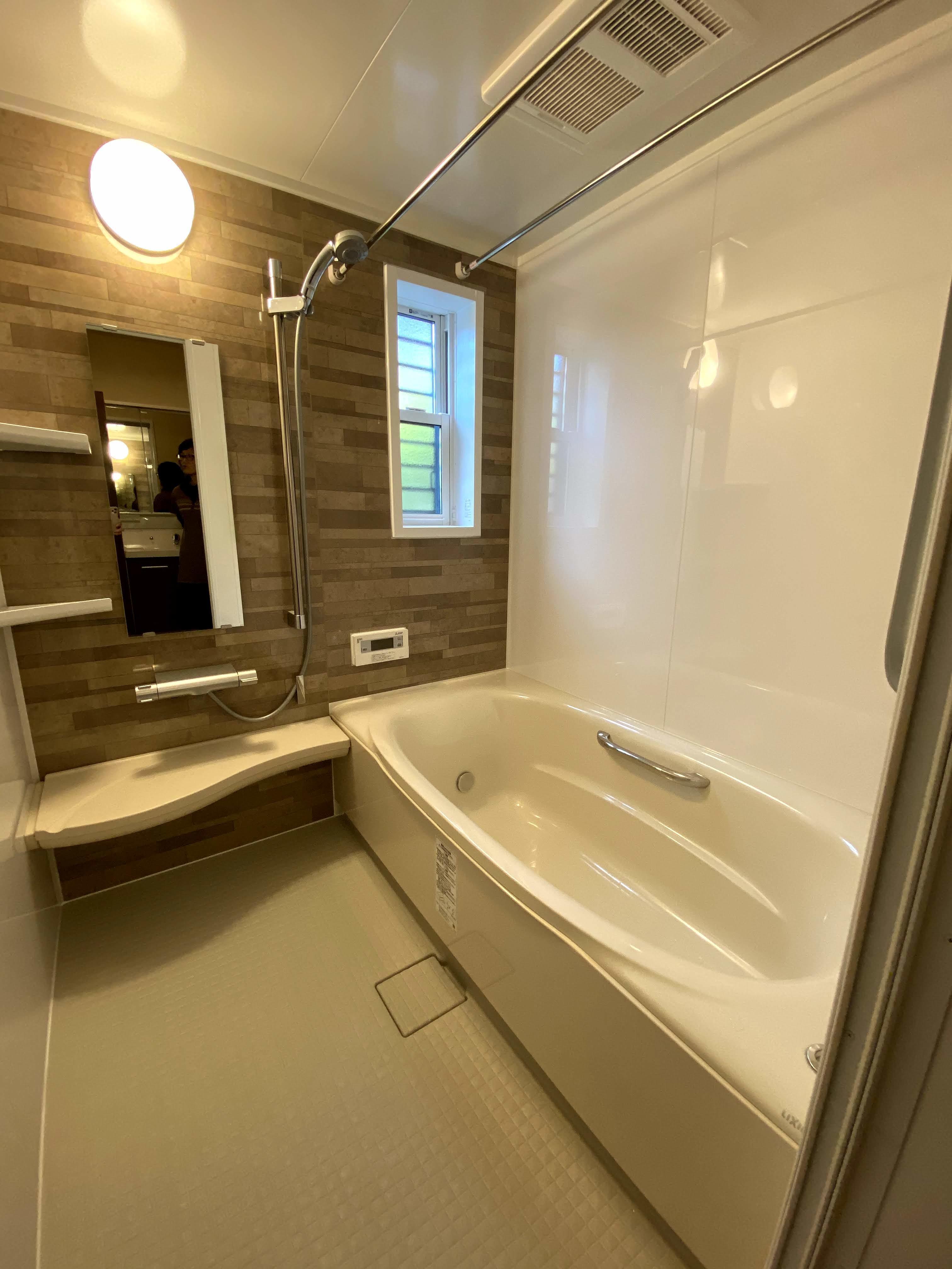 節水、保温性に優れ、かつ、浴室乾燥やお手入れのしやすい床、壁面。 洗練されたデザインで落ち着いた雰囲気の高級感のある浴室となりました。