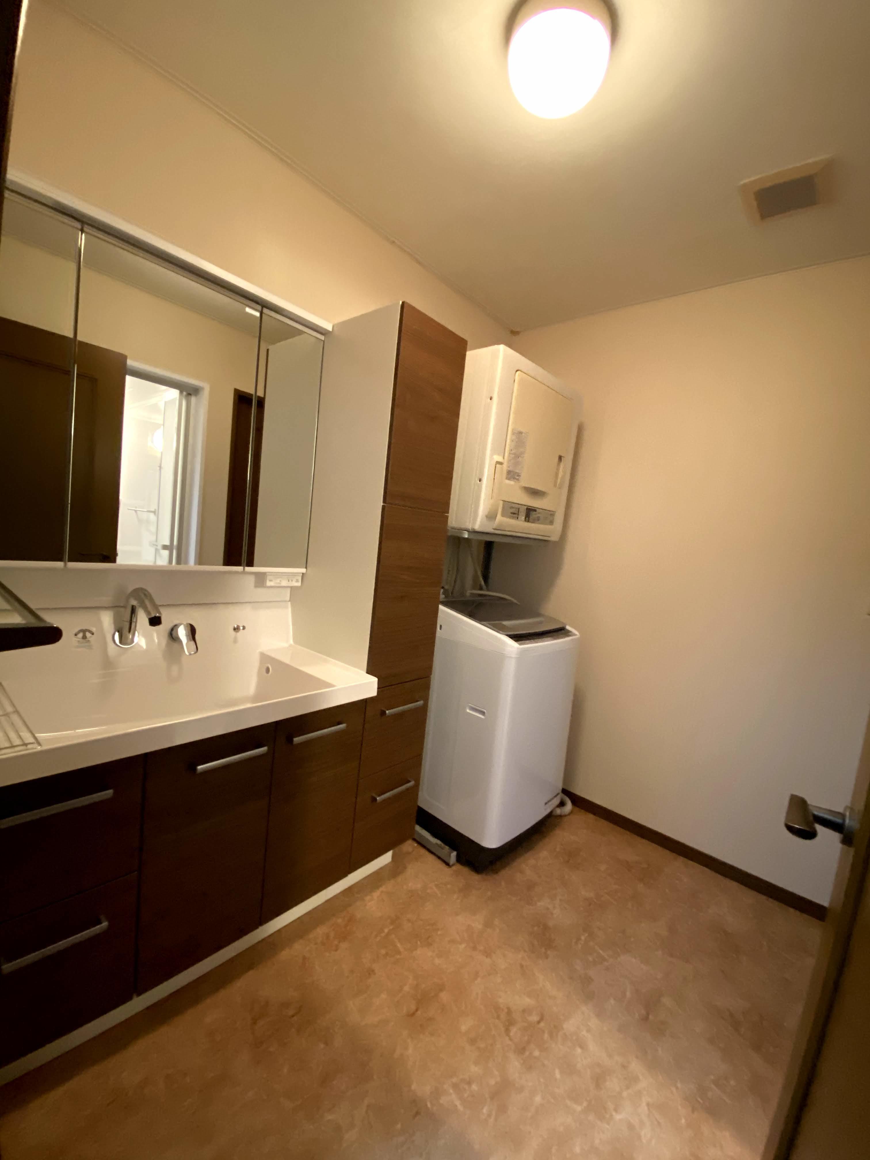 間仕切りを取り払いゆったりとした洗面所に収納スペースがたっぷりあり、洗面ボウルも大きいシックで落ち着いた洗面化粧台設置しました。 高級感のある洗面所になりました。