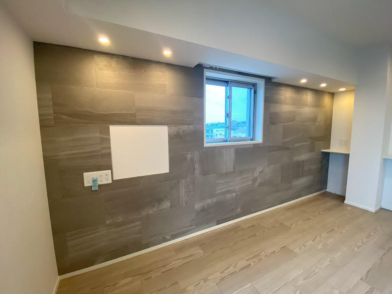 一つの面を内装機能タイルエコカラットを貼り、調湿・脱臭・有害物質低減・お手入れ簡単、 さらにデザイン性にも優れたリビングになりました。