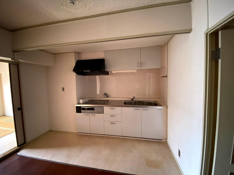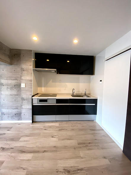 シックにフルリノベーションした部屋に合う色合いで スッキリしたユニットキッチン。おていれのしやすさやも魅力です。