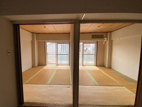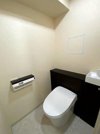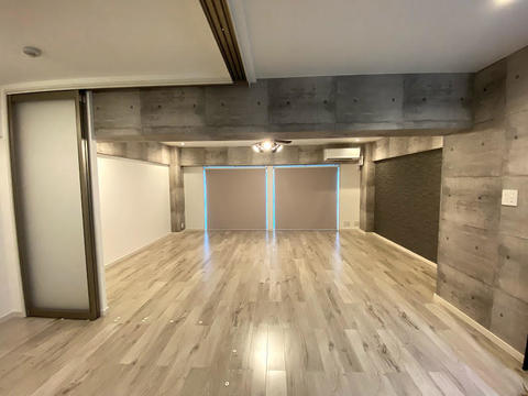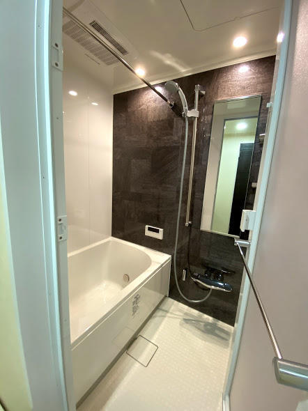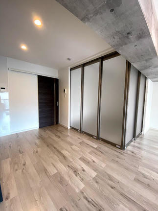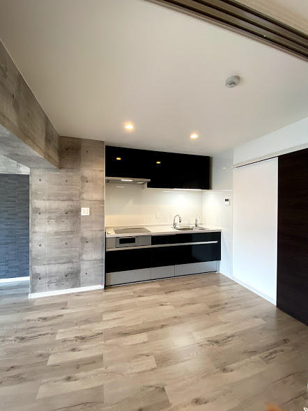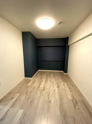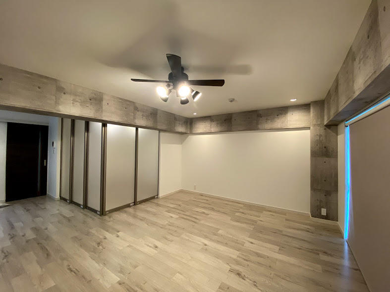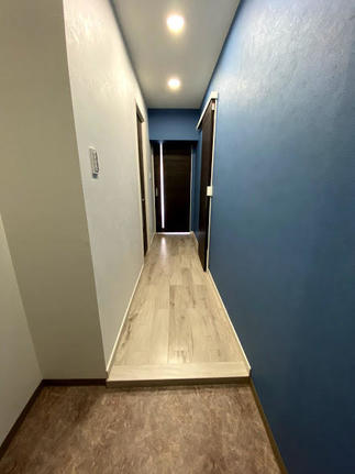 玄関ホールはパッと目を引くコントラスト。部屋は2つの和室を1つの広々としたリビングへ。ダイニングキッチンともつながっており、全体をシックなベージュ、グレーで色調し、照明にもこだわりました。個室は玄関ホールにも使ったブルーをアクセントにおしゃれで落ち着く空間になりました。キッチン、トイレ、バス空間もシックな空間で高級感のある木目調を取り入れました。まるでリゾートホテルのような、それでいて落ち着ける素敵なお部屋となりました。