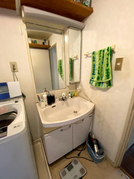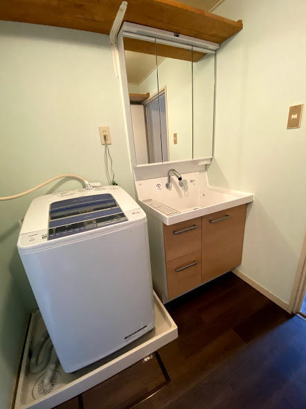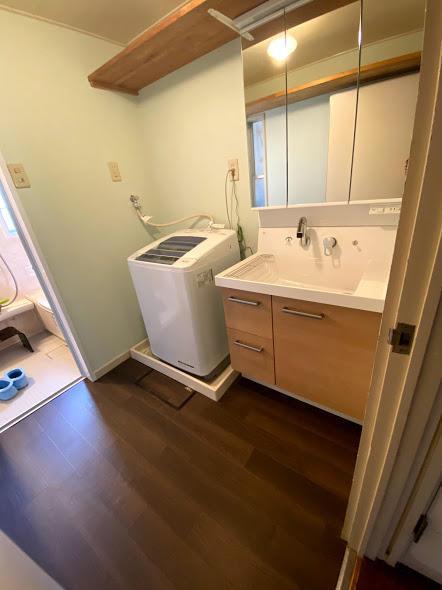 広々としたボウルと快適収納で使いやすい洗面化粧台になりました。また、床は濃い目のフローリング調のクッションフロア、壁は優しいグリーン色のクロスを貼り 清潔感のある落ち着いた洗面所になりました。