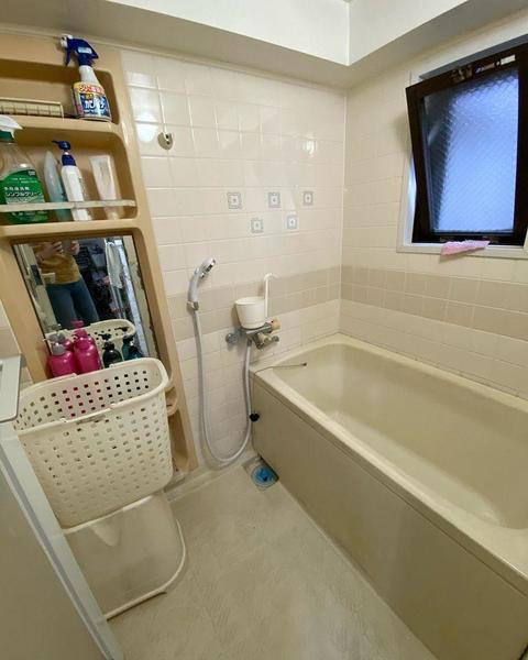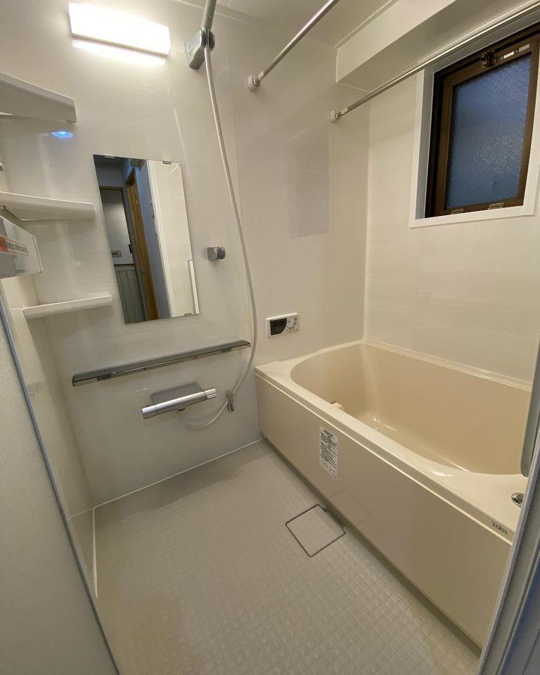 みんなが快適に入浴するために考えられたユニットバス。人造大理石の浴槽が魅力。以前からの梁を1箇所取り、すっきりみえます。