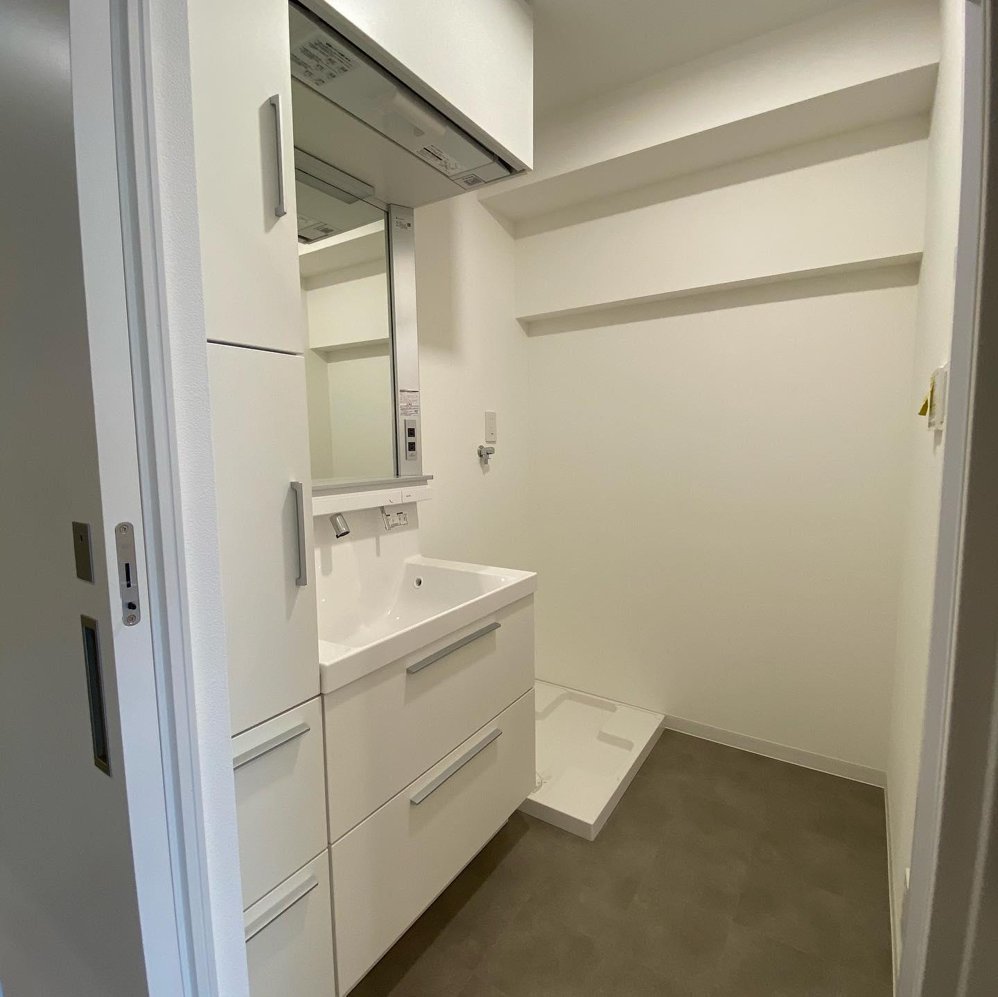 洗面台の位置を替えよりすっきりした空間になりました。 洗面化粧台はタッチレス水栓で上から吐水なのでお手入れ簡単、コンパクトな化粧台なのに収納はたっぷりできアレンジできる収納もセレクトしました。
