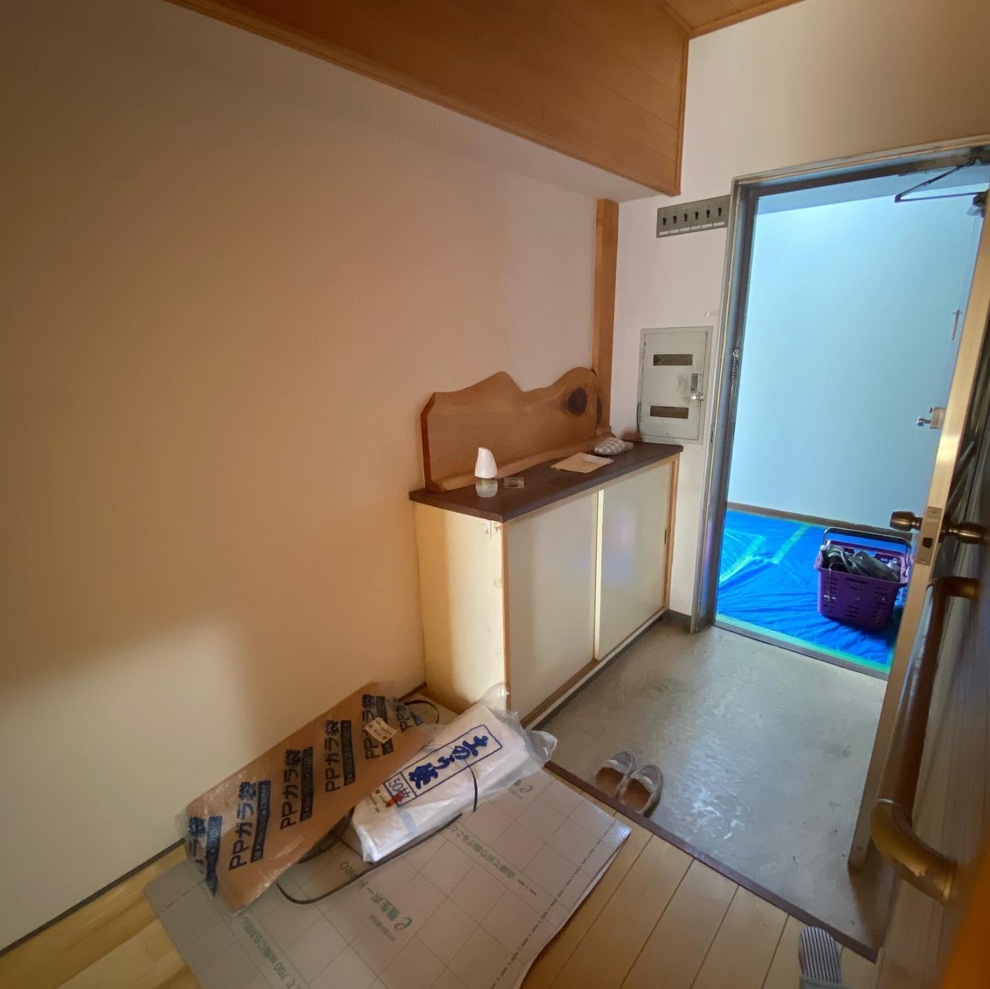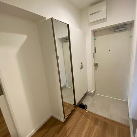 低い玄関収納から背の高い玄関収納に替え、ミラー扉もつけました。