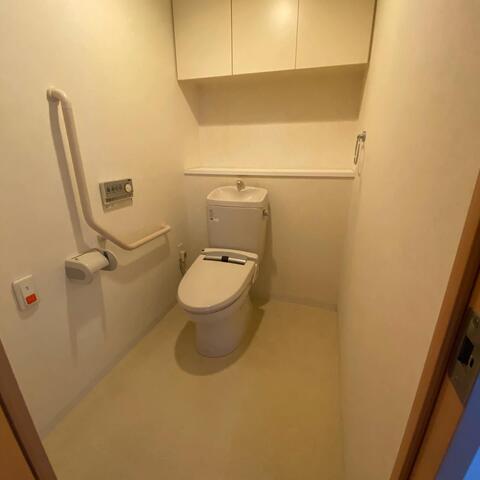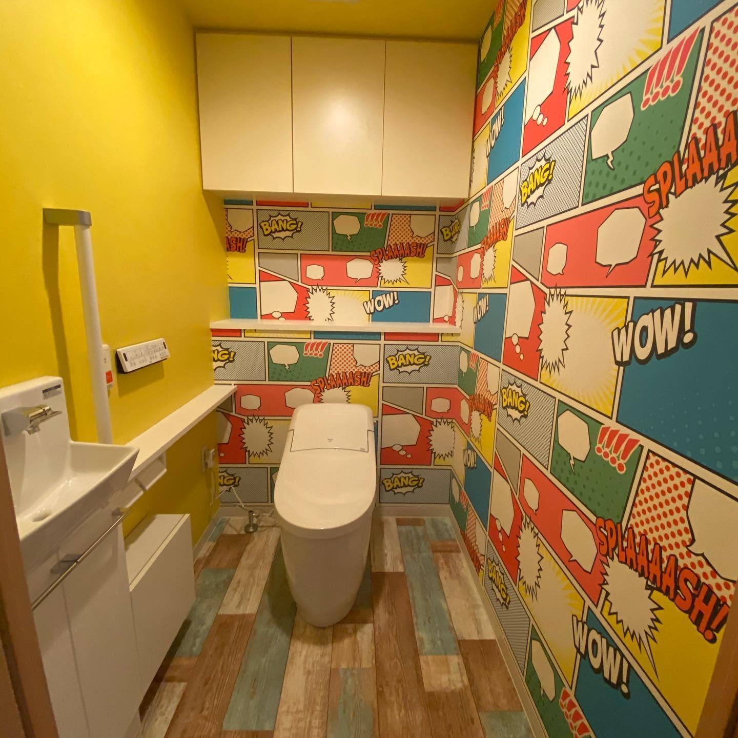 トイレ交換排水移設 一体型シャワートイレ シンプルなデザインからビビットカラーのクロスと黄色いクロスを組み合わせてポップなデザインの空間になりました。