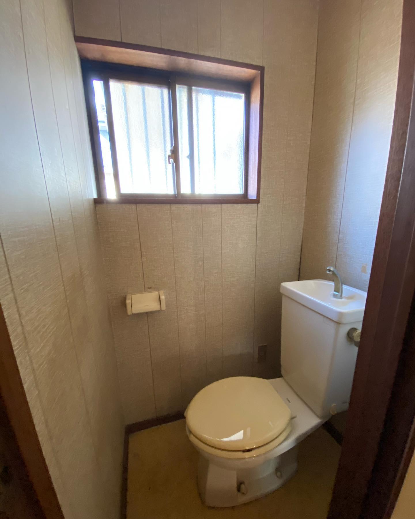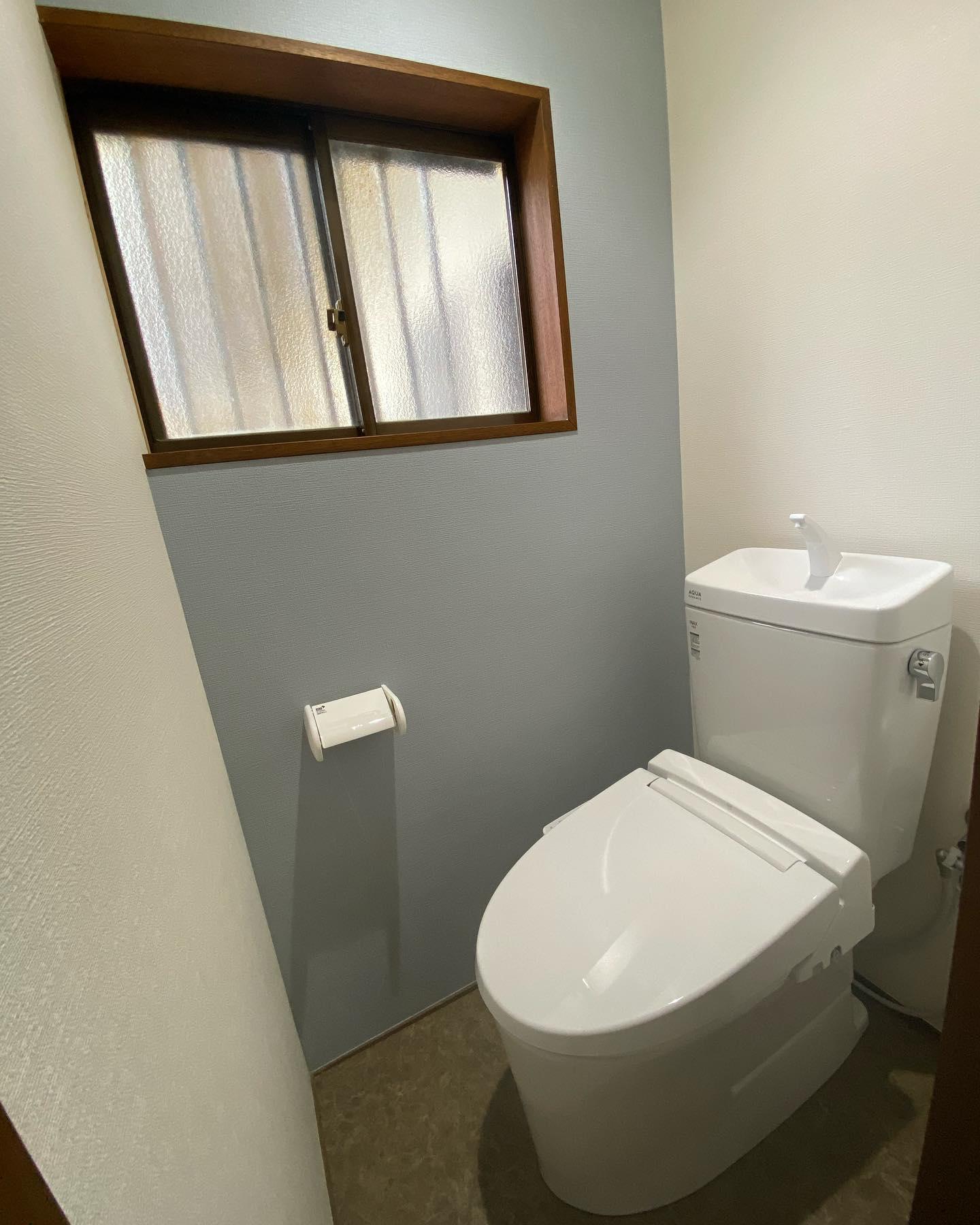 コンパクトで限られたスペースにすっきり収まるトイレを設置しました。 ブルーのアクセントクロスで清潔感のあるトイレになりました。