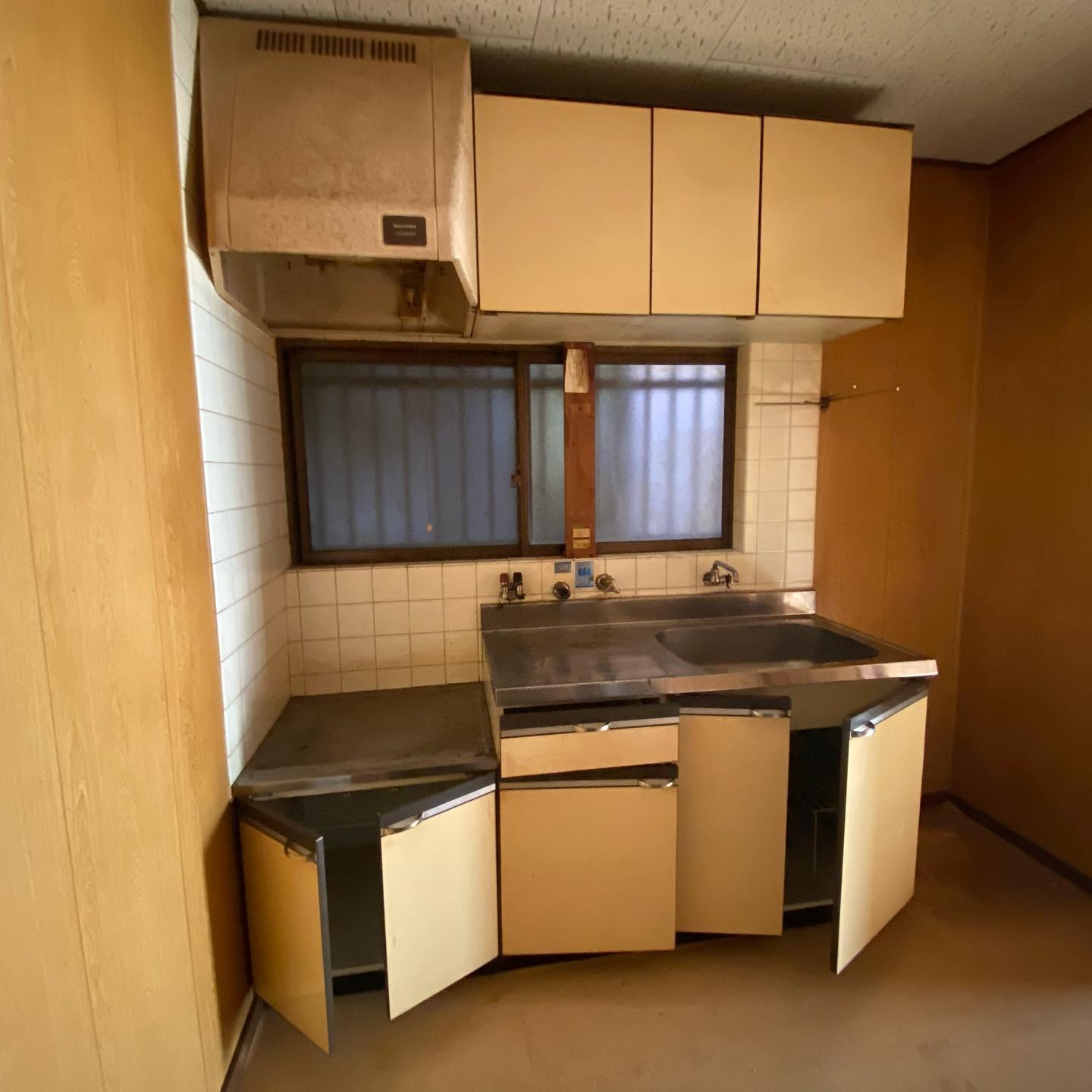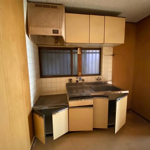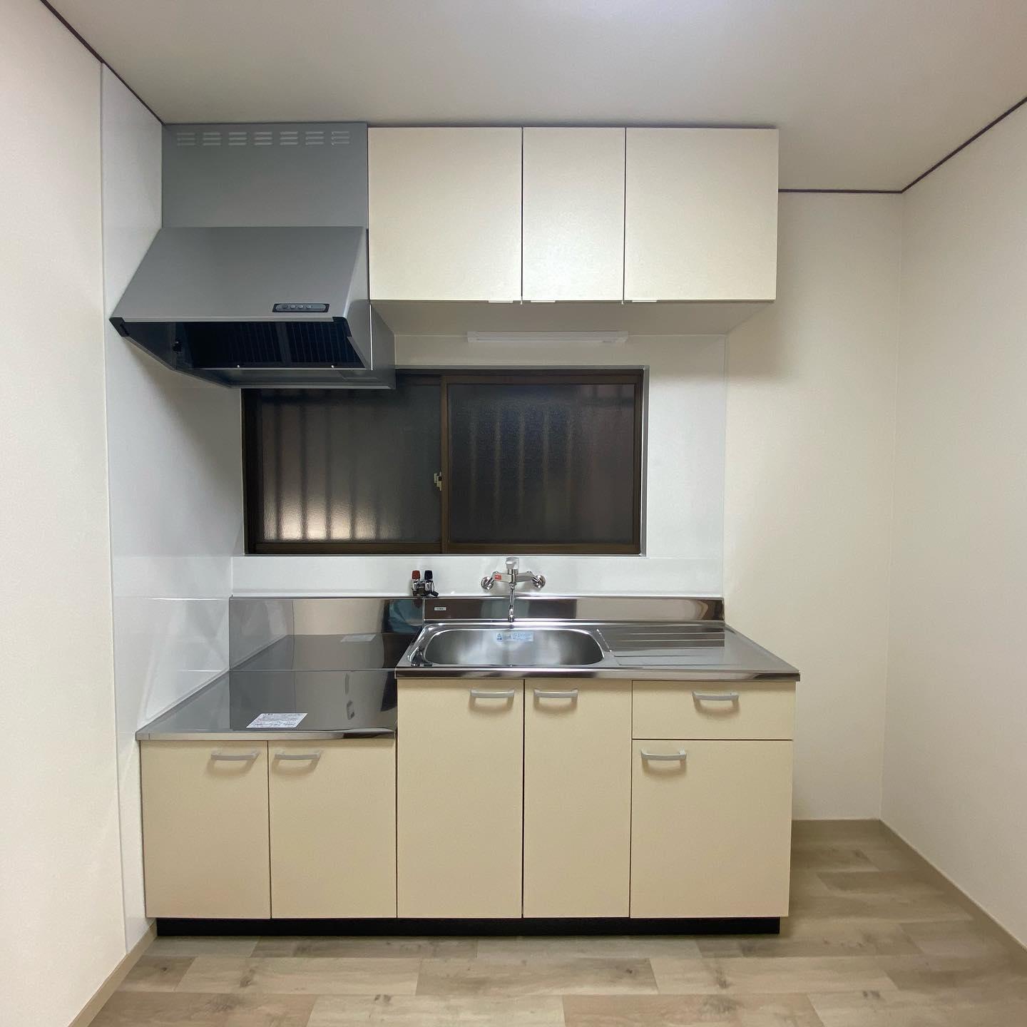シンプルなデザインでコンパクトな木製キッチン。クッションフロアの色合いに合わせてアイボリーをセレクトしました。
