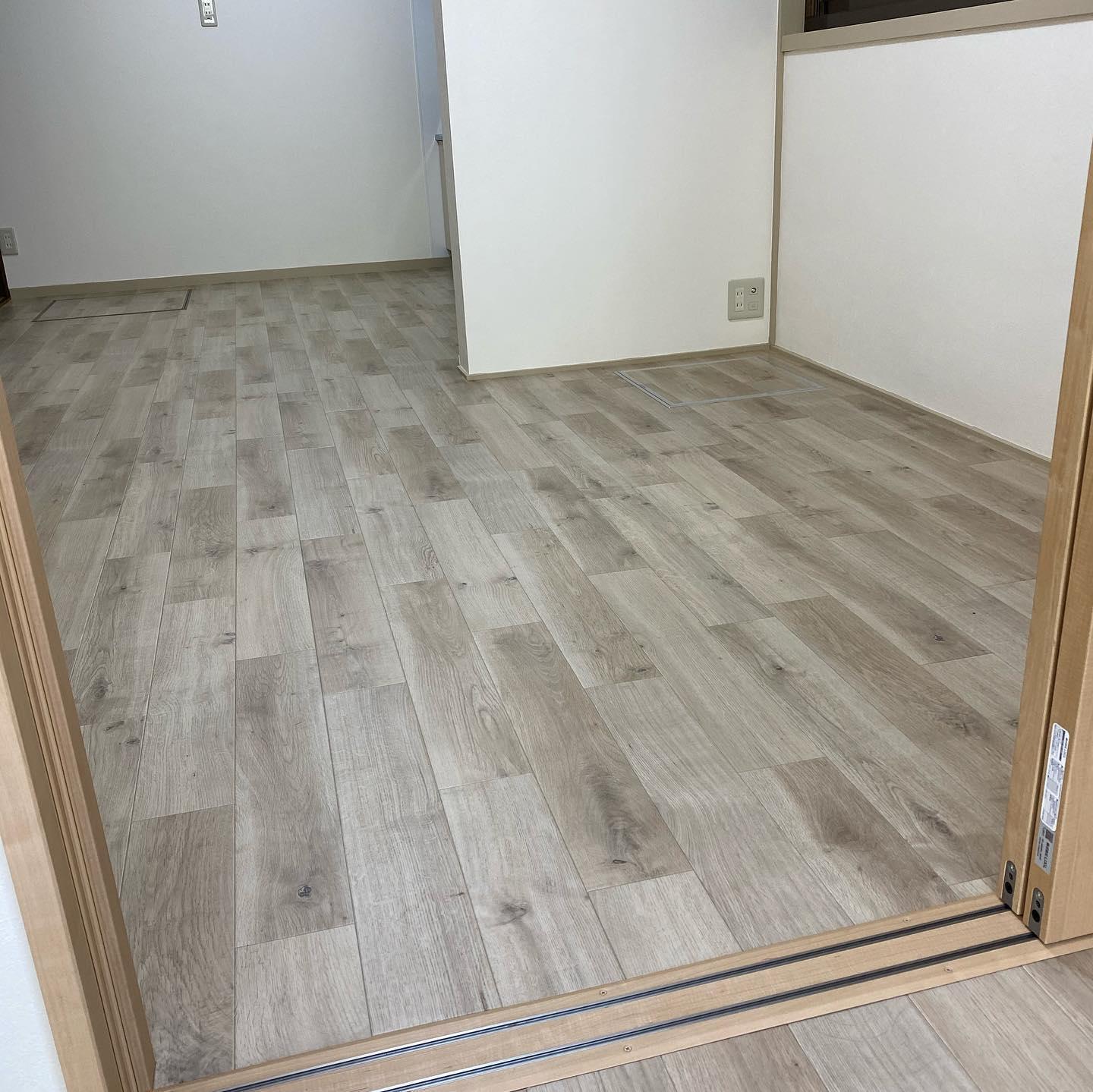 1階の和室を扉を取り外しキッチンから続くリビングダイニングルームの1フロアーにしました。白のクロスににうすい木目調のクッションフロアーで明るくすっきりした空間になりました。