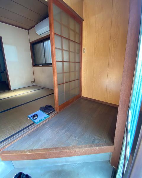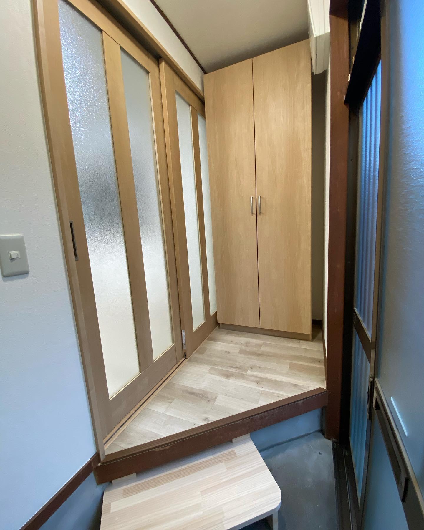 リビングダイニングに続く室内ドアを新調しクッションフロアも室内と同じにして一体感をもたせました。玄関収納を背の高いタイプにして収納性をあげました。 また、お手製のふみ台で上がり降りも楽になりました。