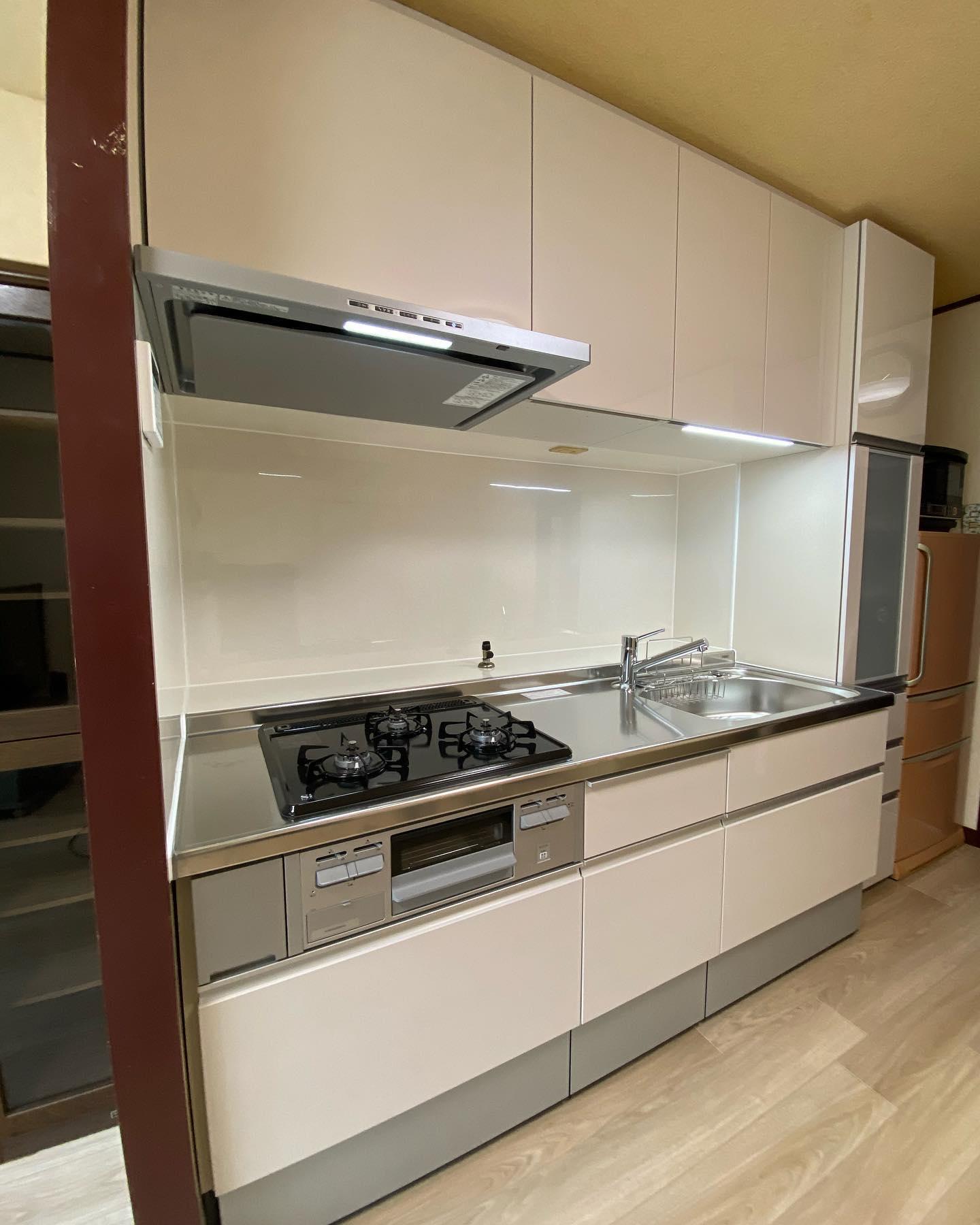 好きなデザインとパーツを選べるシリーズで飽きのこないシンプルなシステムキッチンに交換しました。キッチンを縮小し今の生活に合ったキッチンへ。色味で圧迫感を感じません。床クッションフロア交換、キッチンパネルでお手入れもしやすくなりました。
