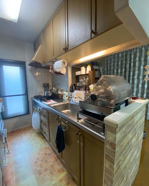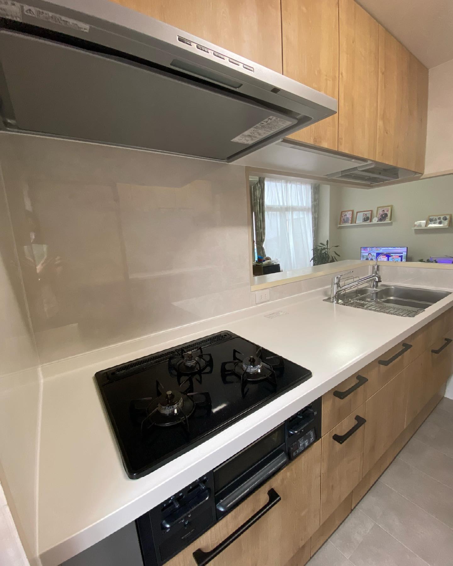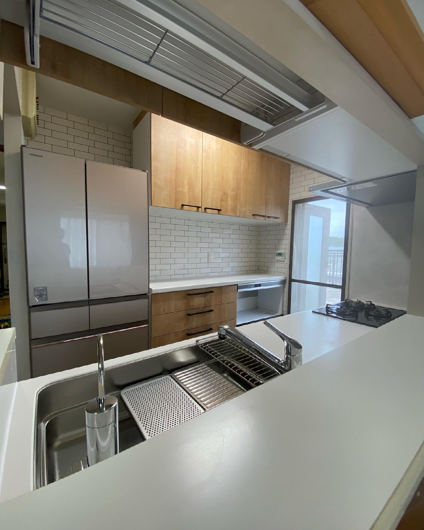 LIXILアレスタ Wサポートシンクで魚をさばけます。天板上でフィルター交換できる浄水器なのでお手入れ簡単。 カップボード&家電収納設置し、使いやすくなりました。 タイル調のクロスで明るくお洒落なキッチンになりました。