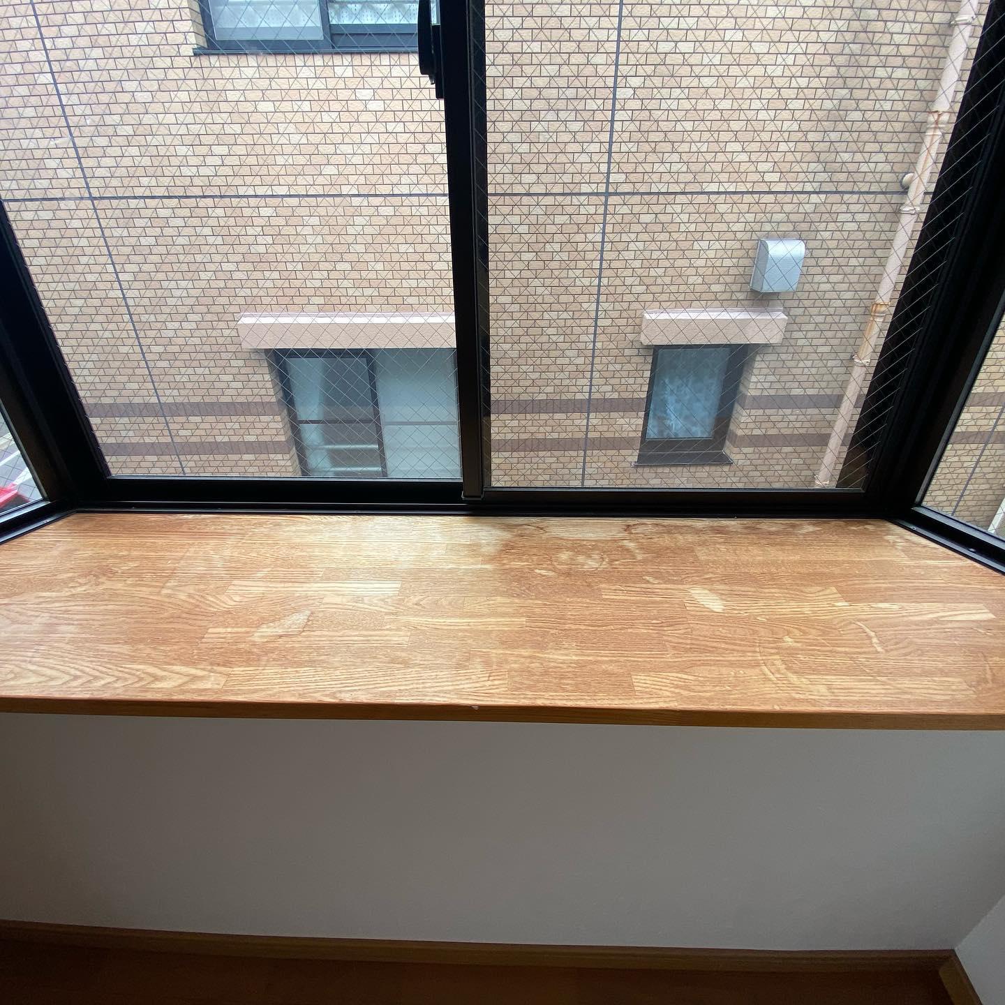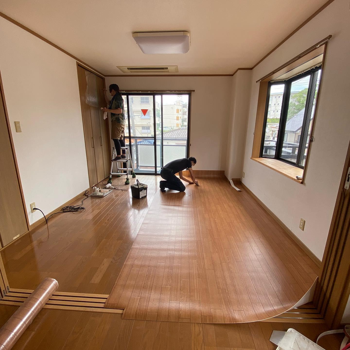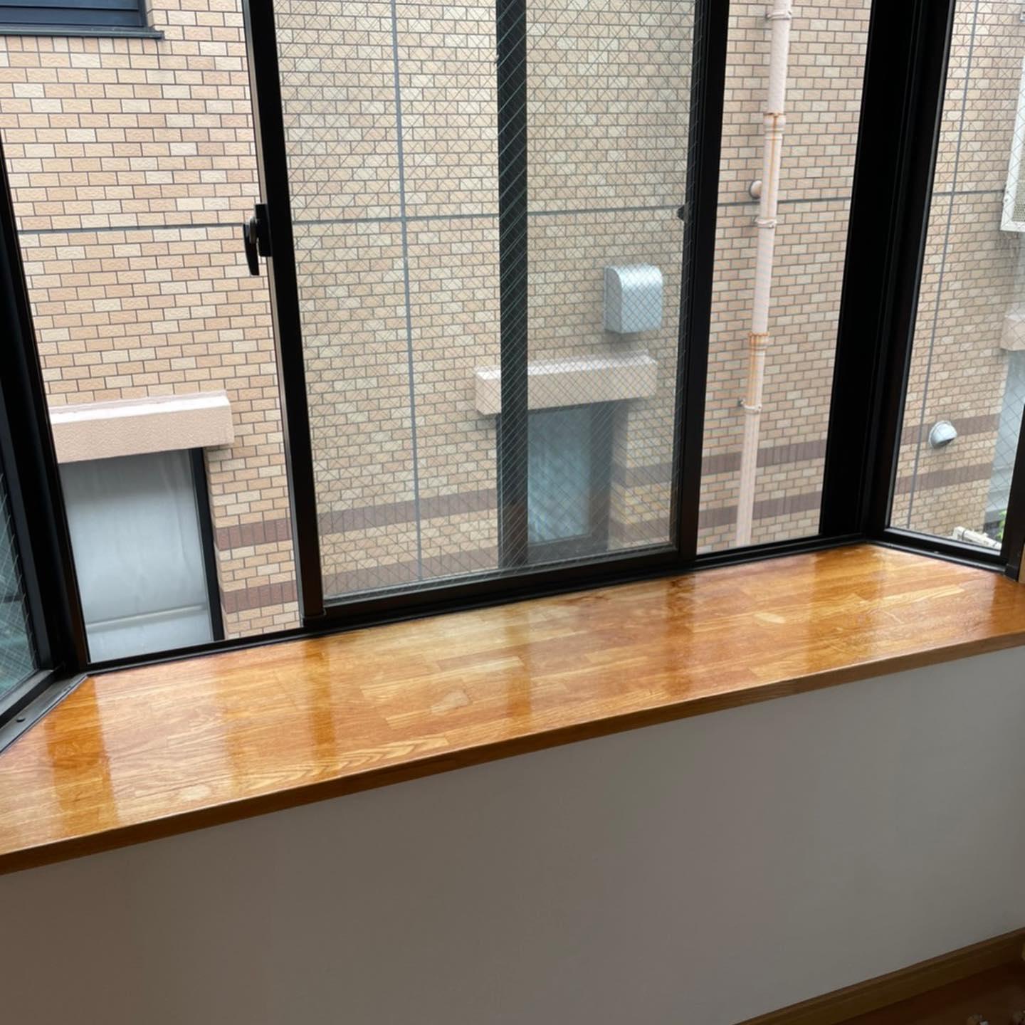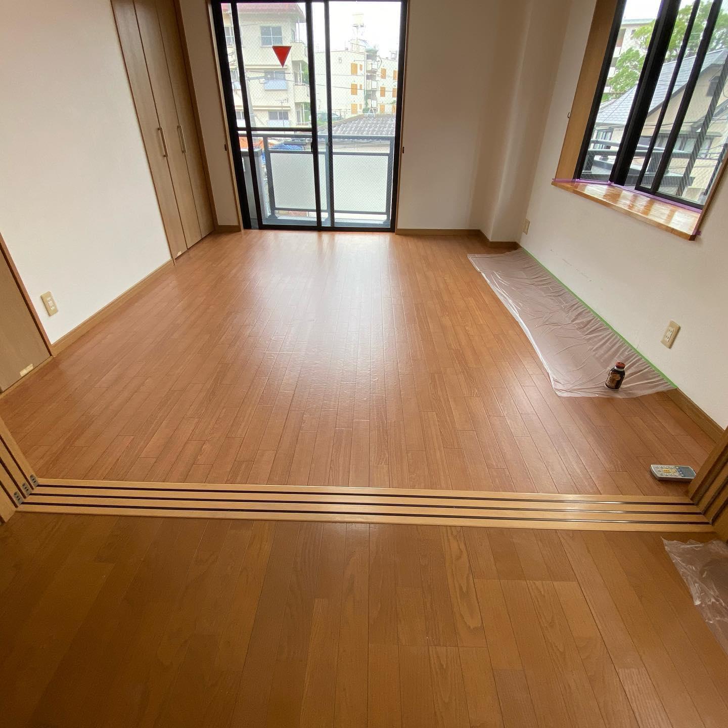 汚れやキズ、日焼けの目立ったフローリングにクッションフロアを上張りし、出窓の台もクリア塗装してピカピカになりました。 凹んで穴の目立っていたクローゼットの扉もパテ埋めして着色。ほとんど分からなくなっています。 1日の工期で、新築のように気持ちの良いお部屋になりました。