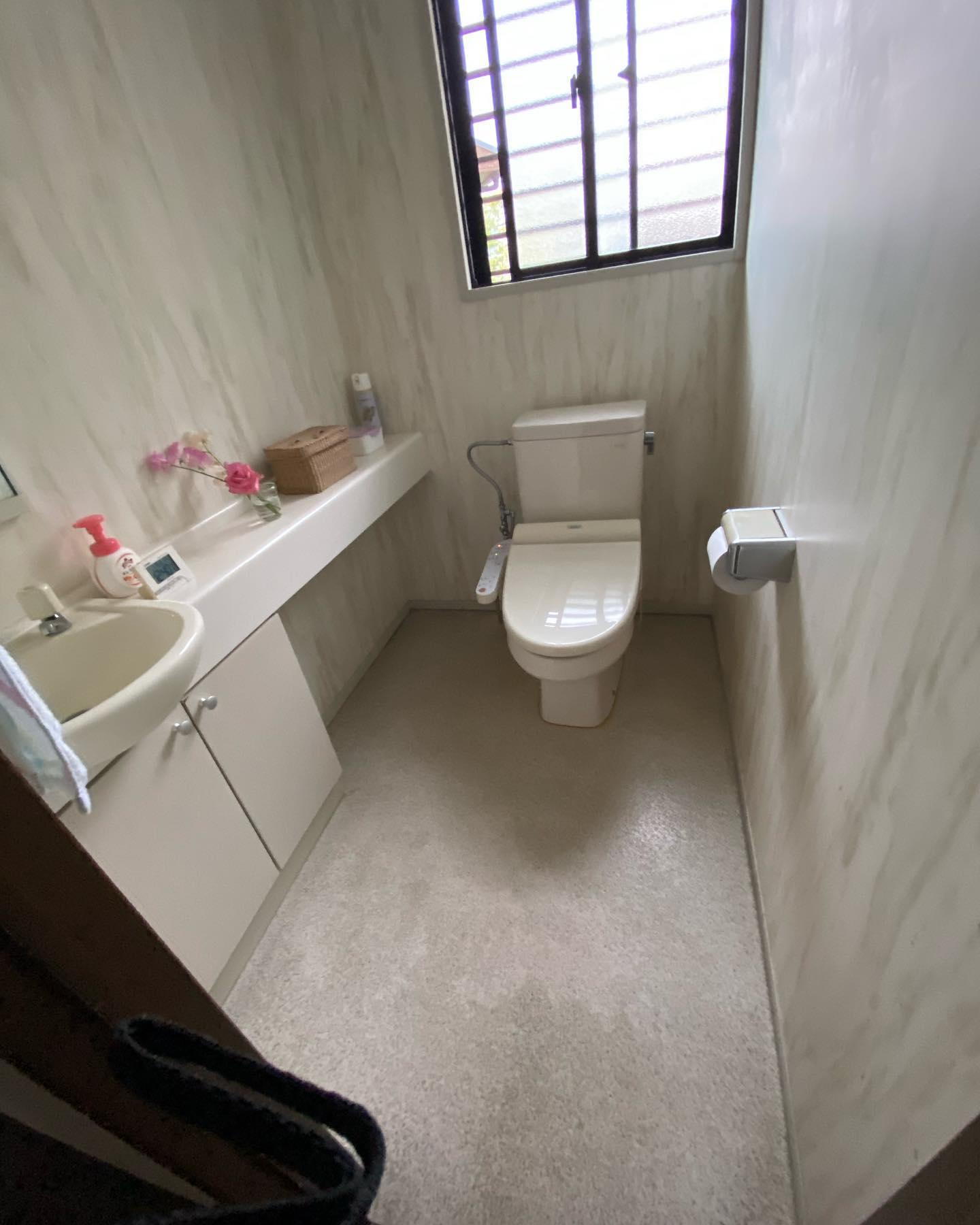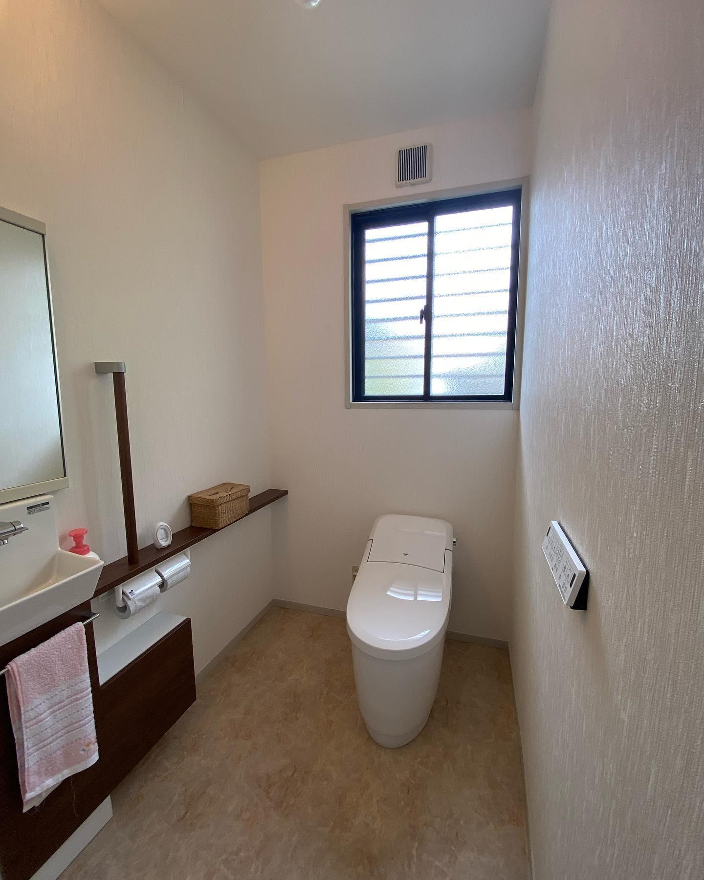 LIXILトイレ(プレアスLS) LIXIL手洗いカウンター(コフレル) クロス・クッションフロアを張り替え、手すりも設置。 ダ-クな木目の収納とカウンターで落ち着いた雰囲気に。 ミラーは再利用し位置を移動しました。 節水トイレ・手すりでグリーン住宅ポイント申請をしました。