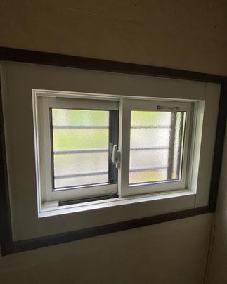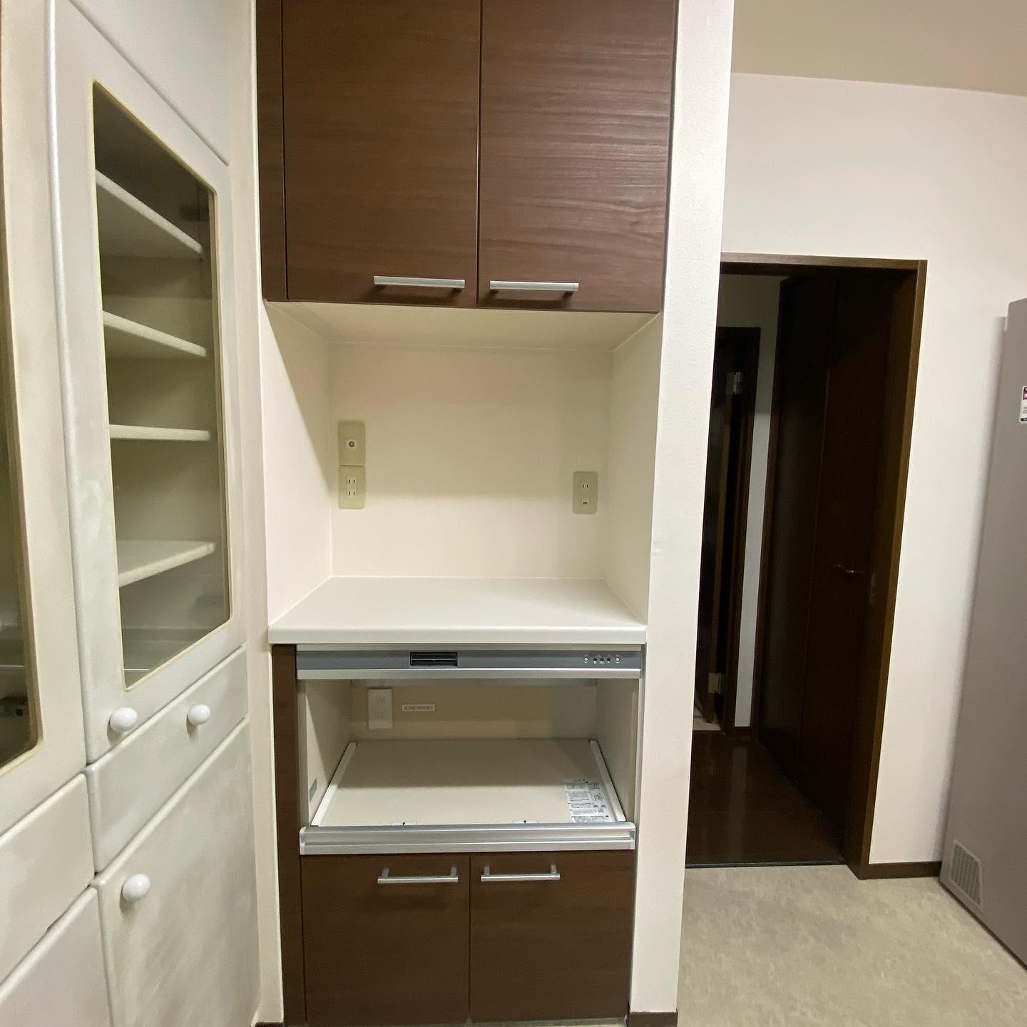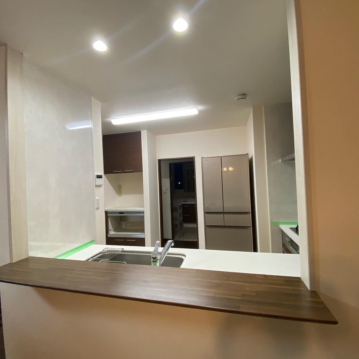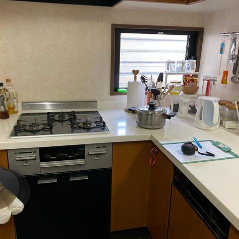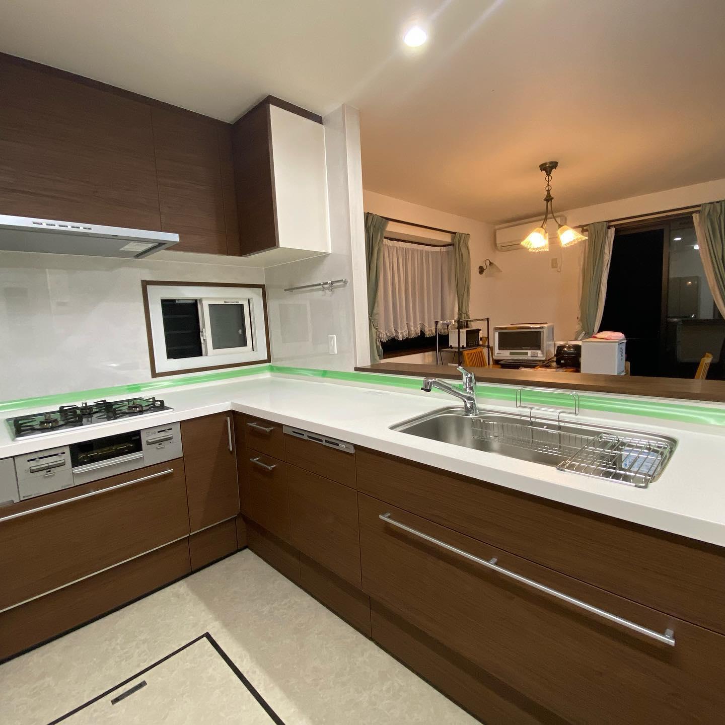 LIXILアレスタのL字キッチン、家電収納棚も木目のクリエモカでカラーコ-ディネイト。 対面シンク上の吊戸棚を撤去し、ダイニングからキッチンへ天井が繋がりスッキリ広々空間に。 結露を防ぐペアガラスの窓に。