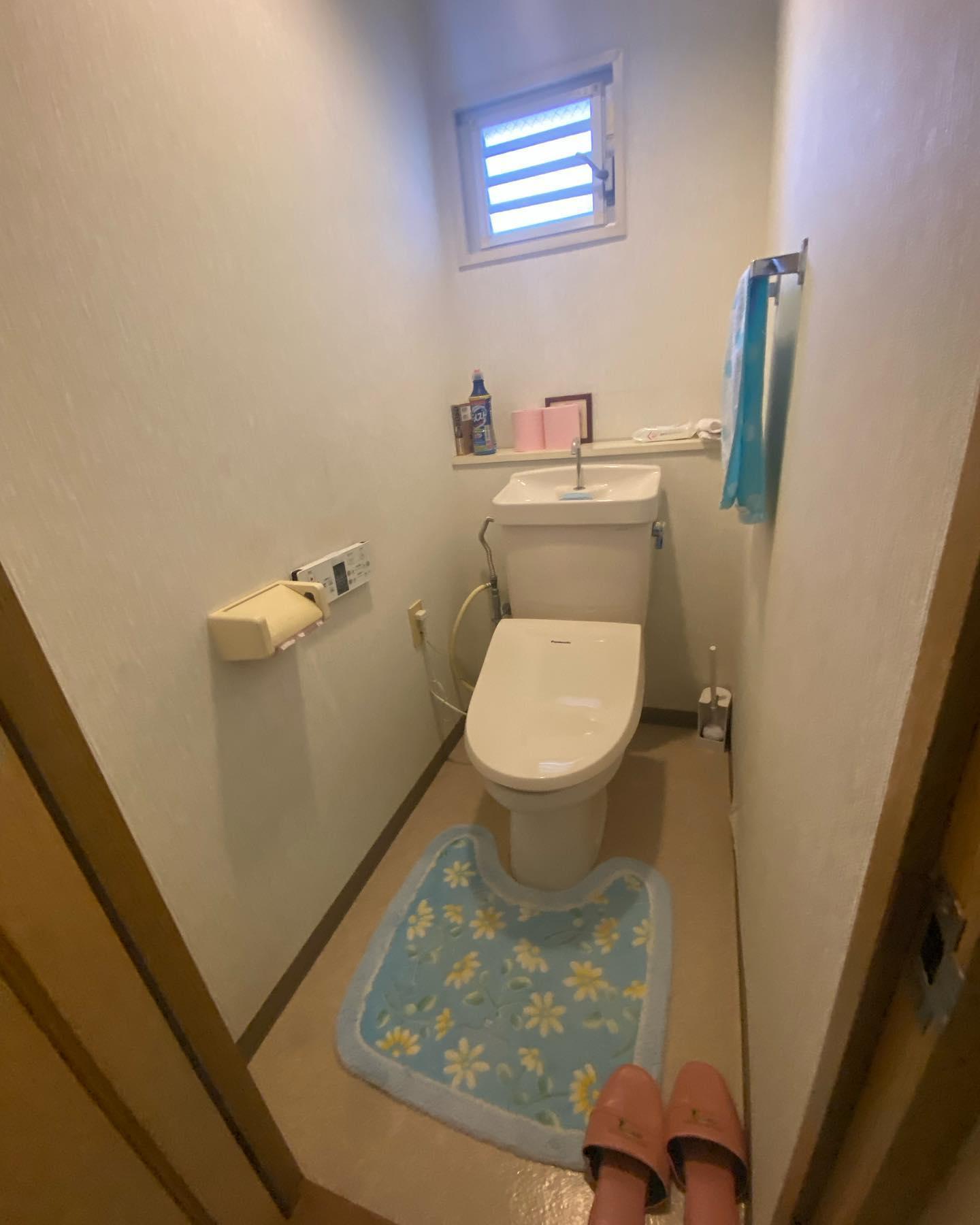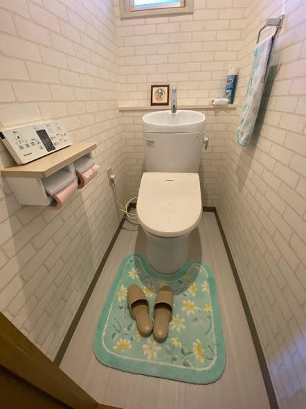 クッションフロア貼り替え、クロスは白煉瓦調でアクセント。 ダウンライトはLEDに交換しました。 節水型トイレでグリーン住宅ポイント申請をしました。