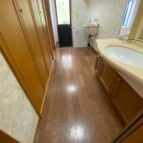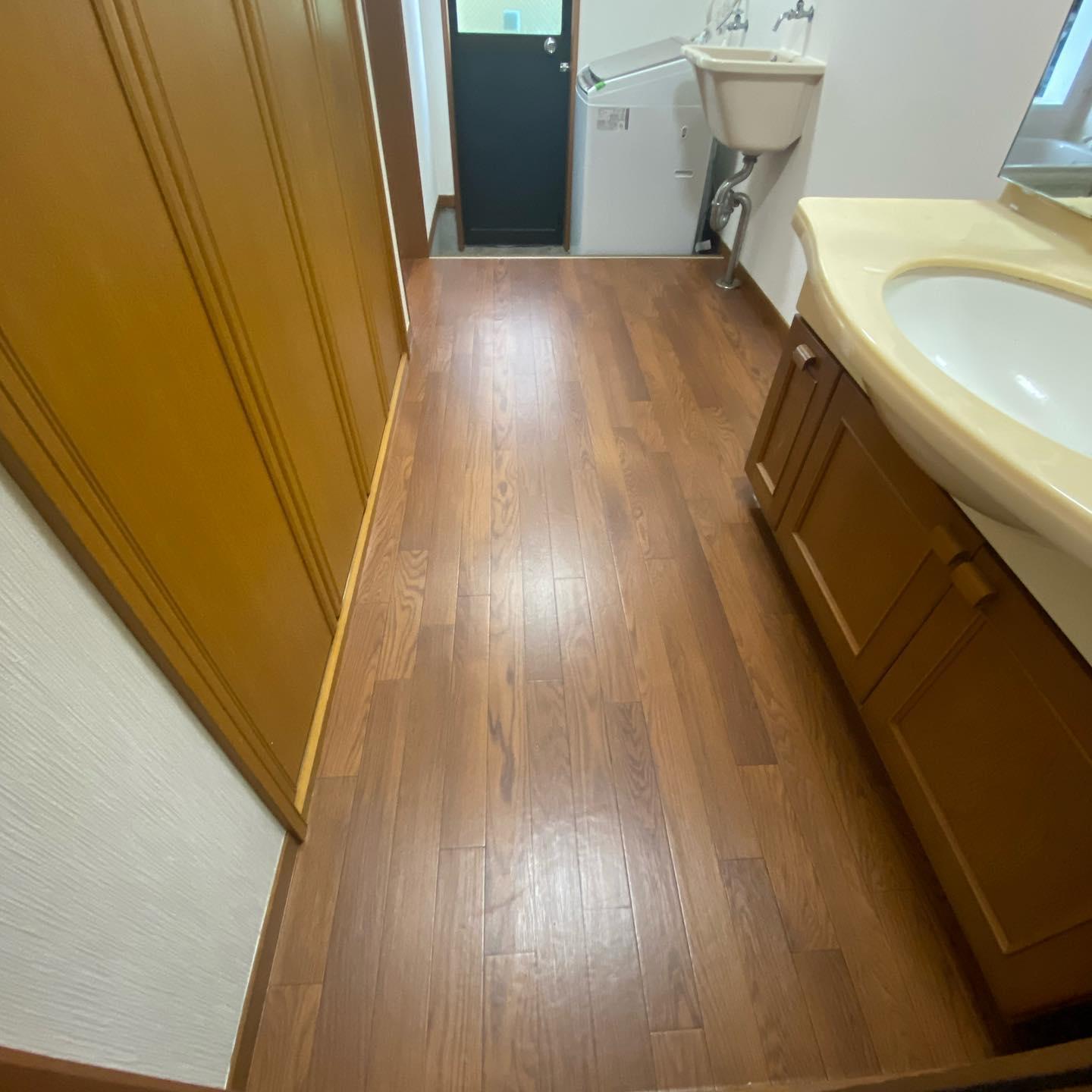 戸建の洗面所部分の内装リフォームです。 フローリングからクッションフロアを重ね貼り、壁天井クロス貼り替えました。