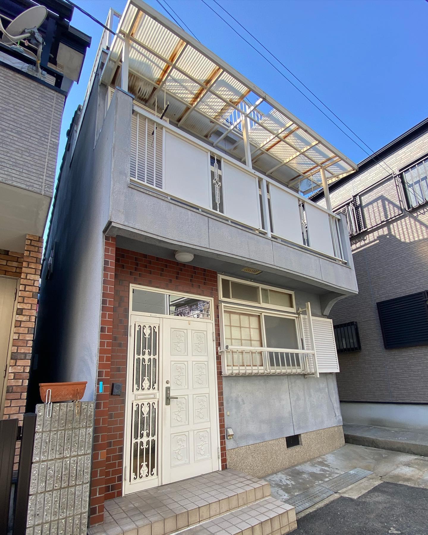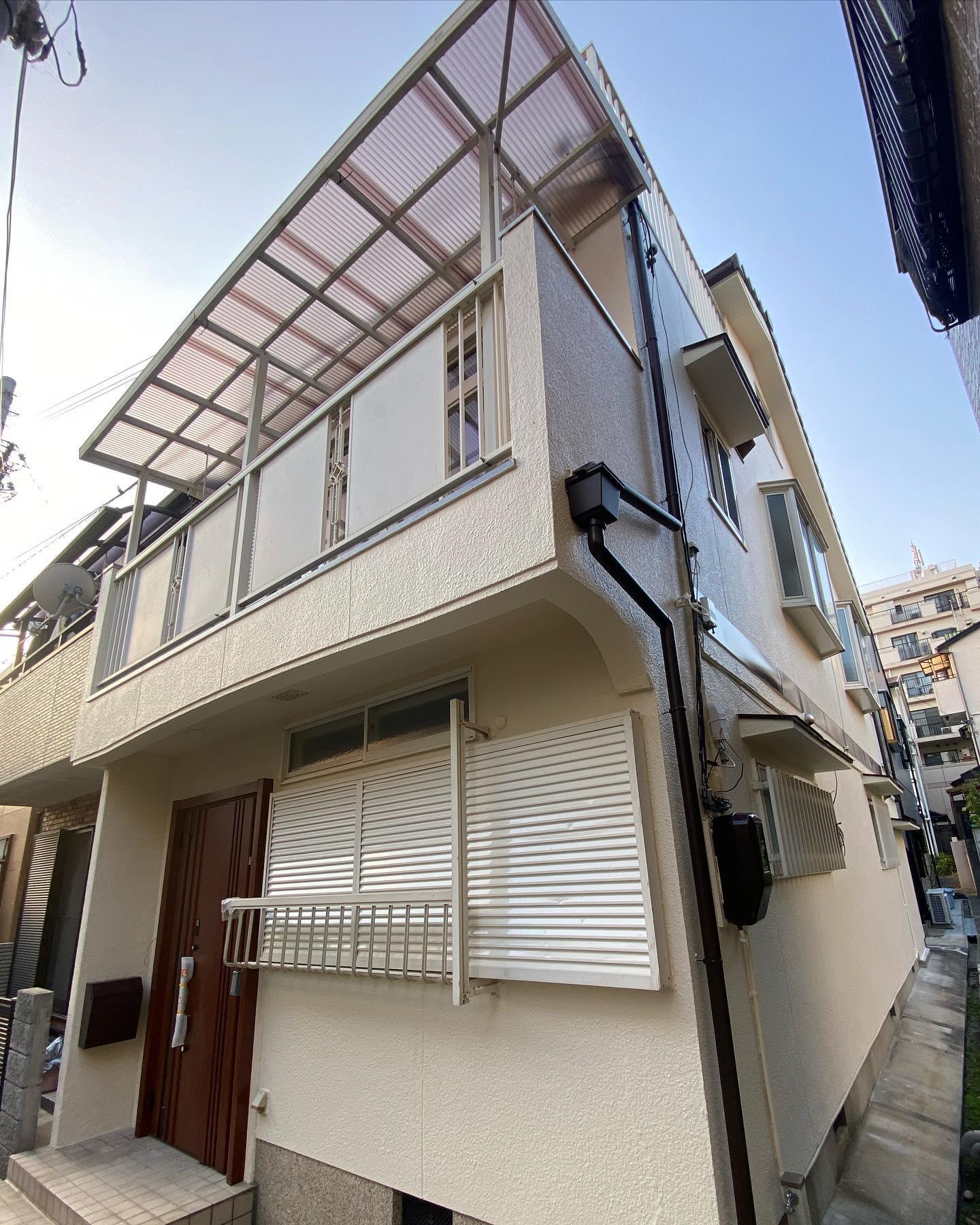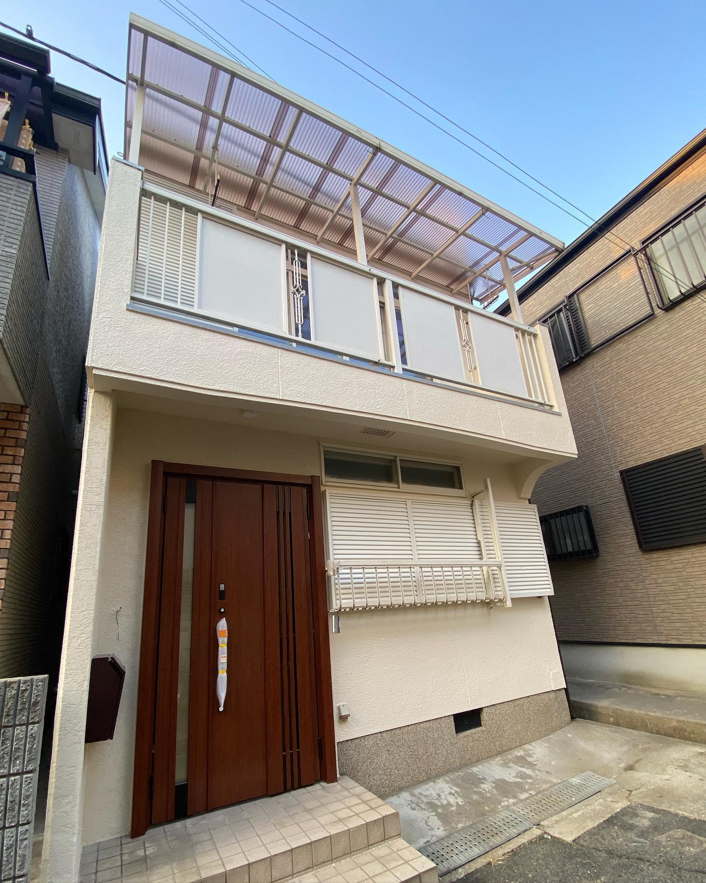 戸建ての外装リフォーム。 屋根葺き替え、雨樋の交換、ベランダ・バルコニー防水、玄関ドア交換、波板交換。 外壁塗装はクリーム色に、ドアの濃茶が映えるスッキリした外観になりました。