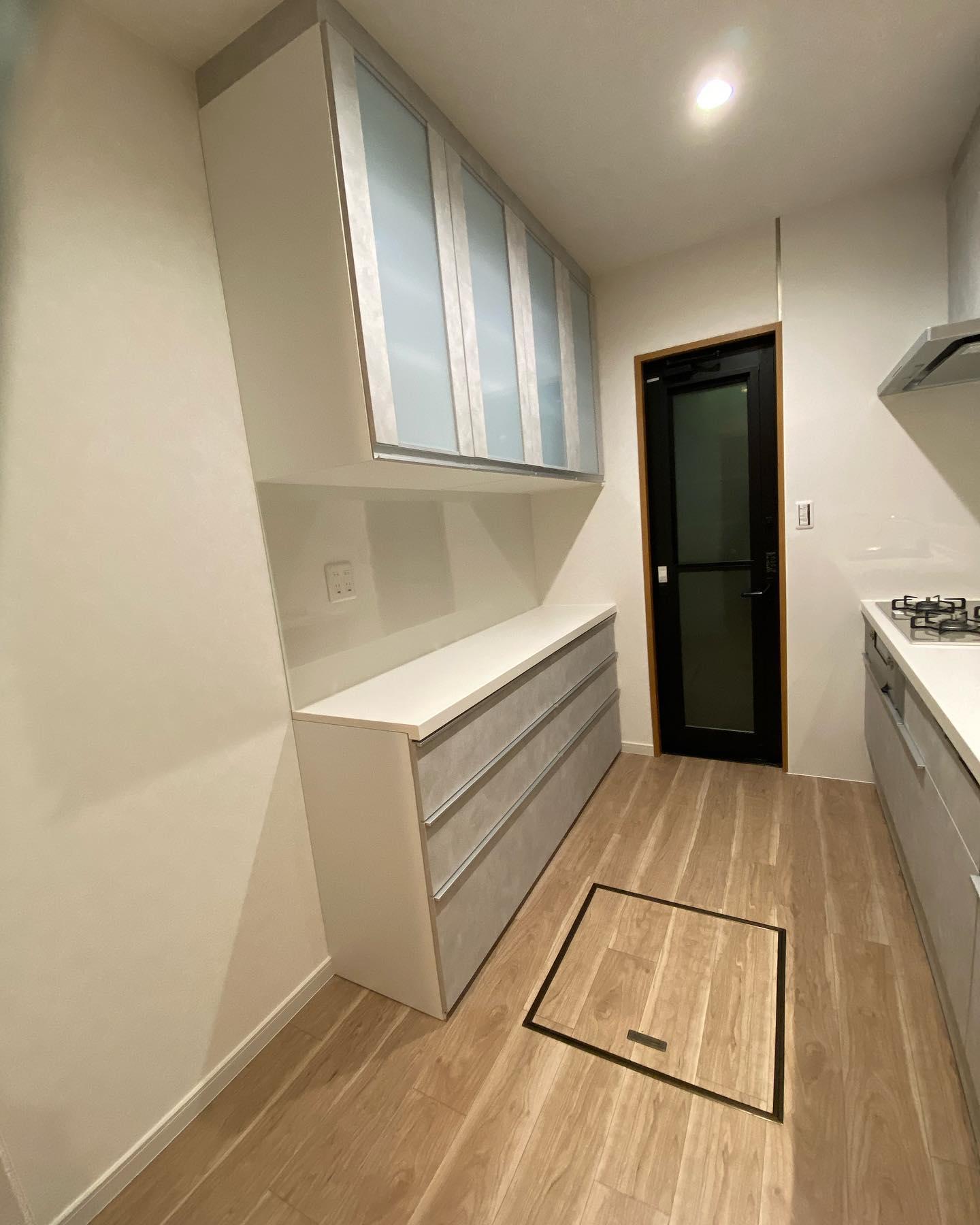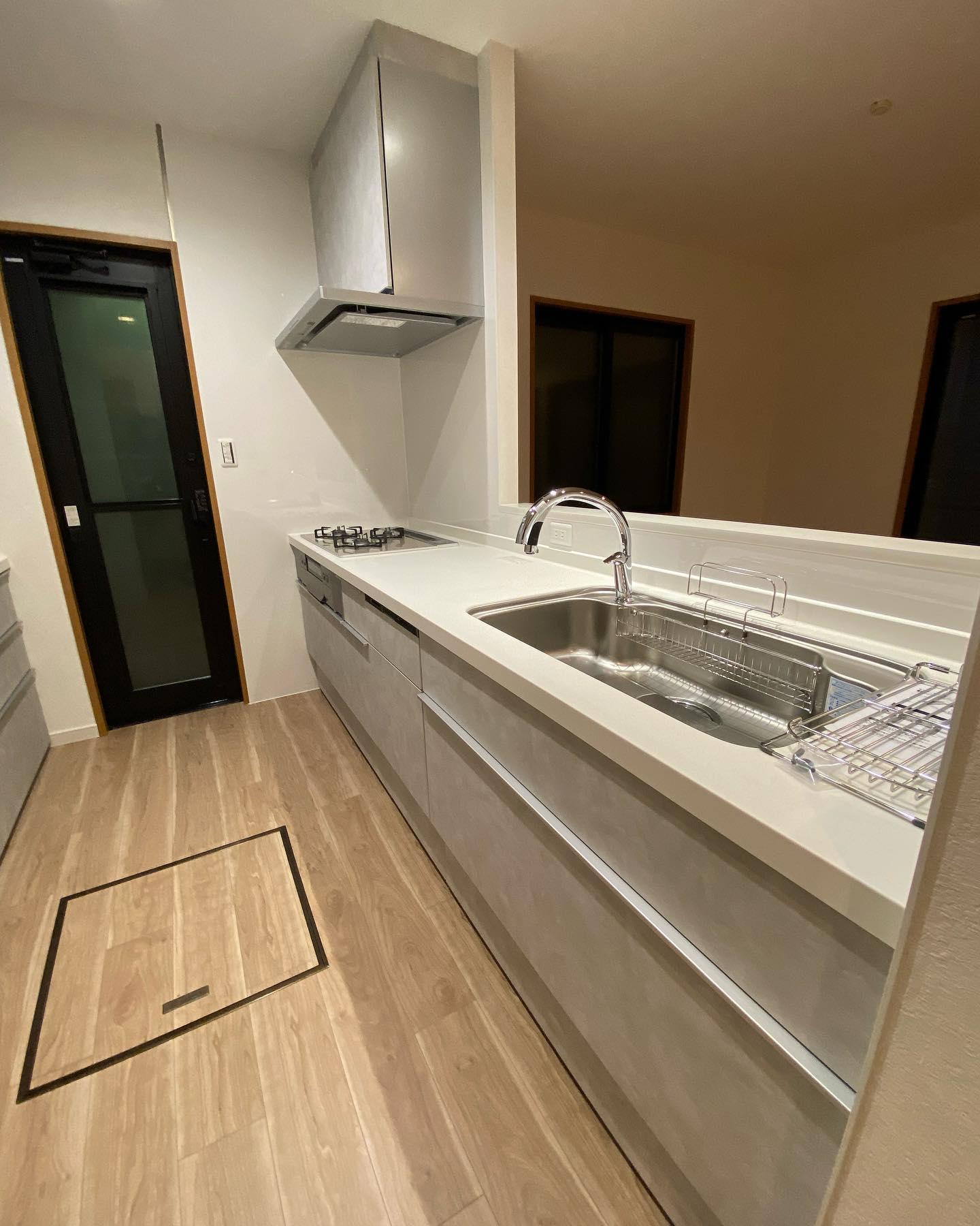 キッチン・カップボード交換(LIXILシエラS) 吊戸棚・袖壁を撤去し、カウンター交換(Panasonic耐水カウンター) 配線移設、ダウンライトLEDに交換しました。 孤立したキッチンからリビングと一体の広々開放的なオープンキッチンに生まれ変わりました!