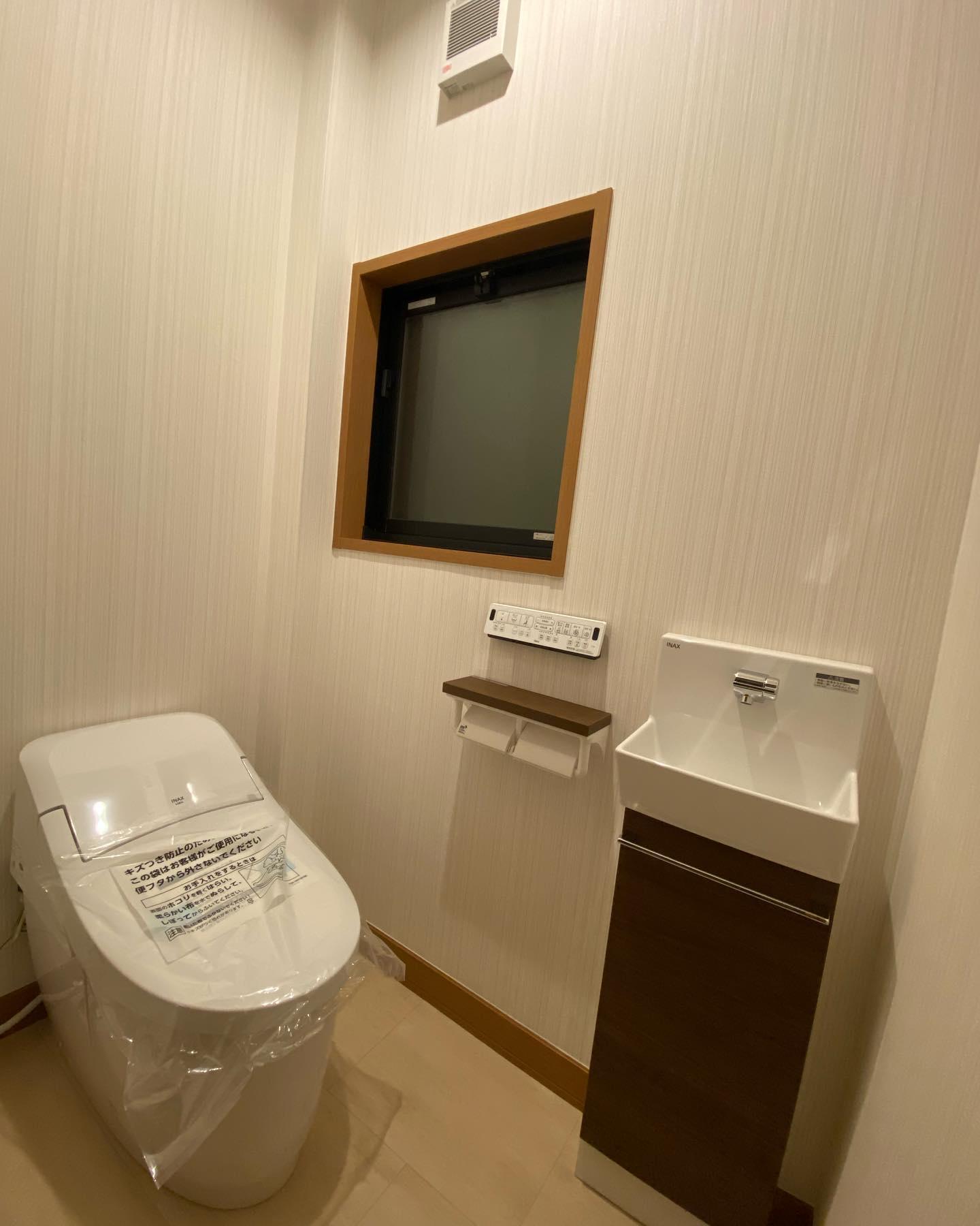 トイレリフォームLIXILプレアス、手洗いLIXILコフレル使用、クロス・クッションフロア貼り替え。