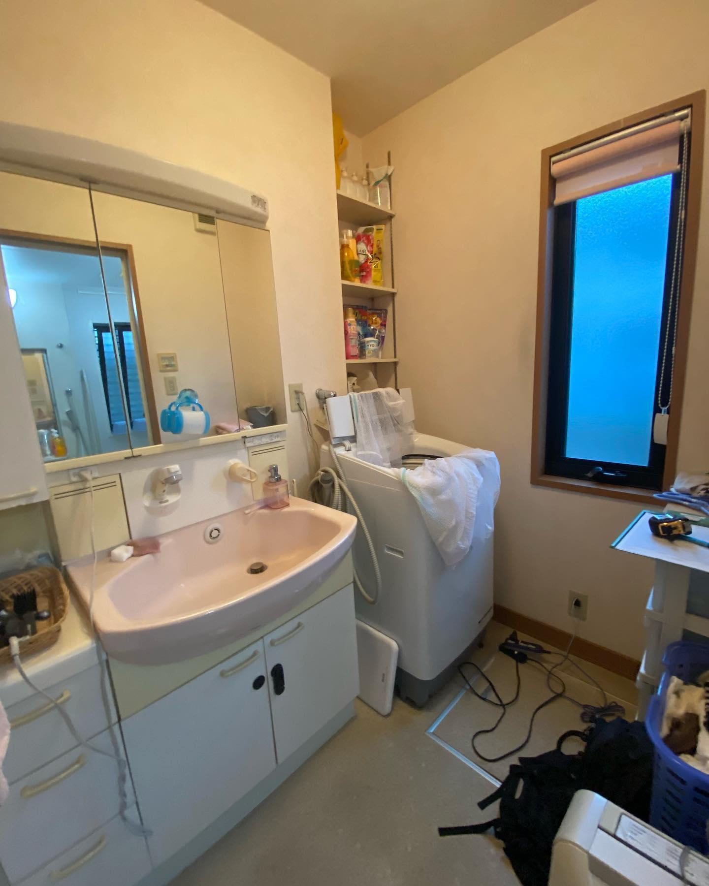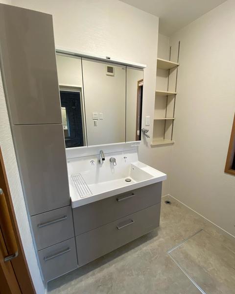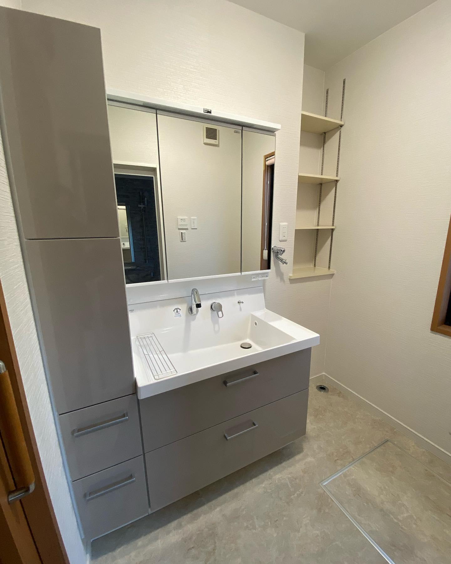 洗面所リフォームLIXILピアラ使用、大きな洗面ボウルで掃除もしやすく使い勝手アップ。 たっぷり収納でスッキリ。クロス・クッションフロア貼り替え。
