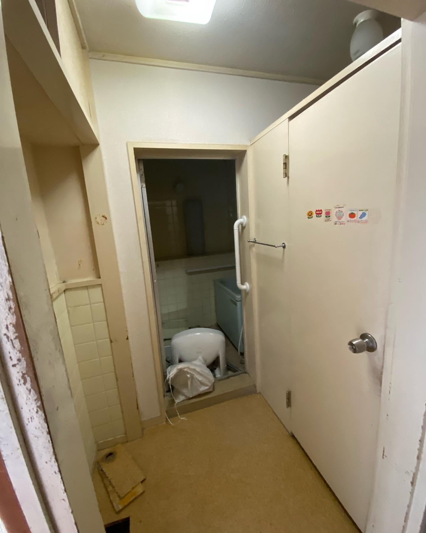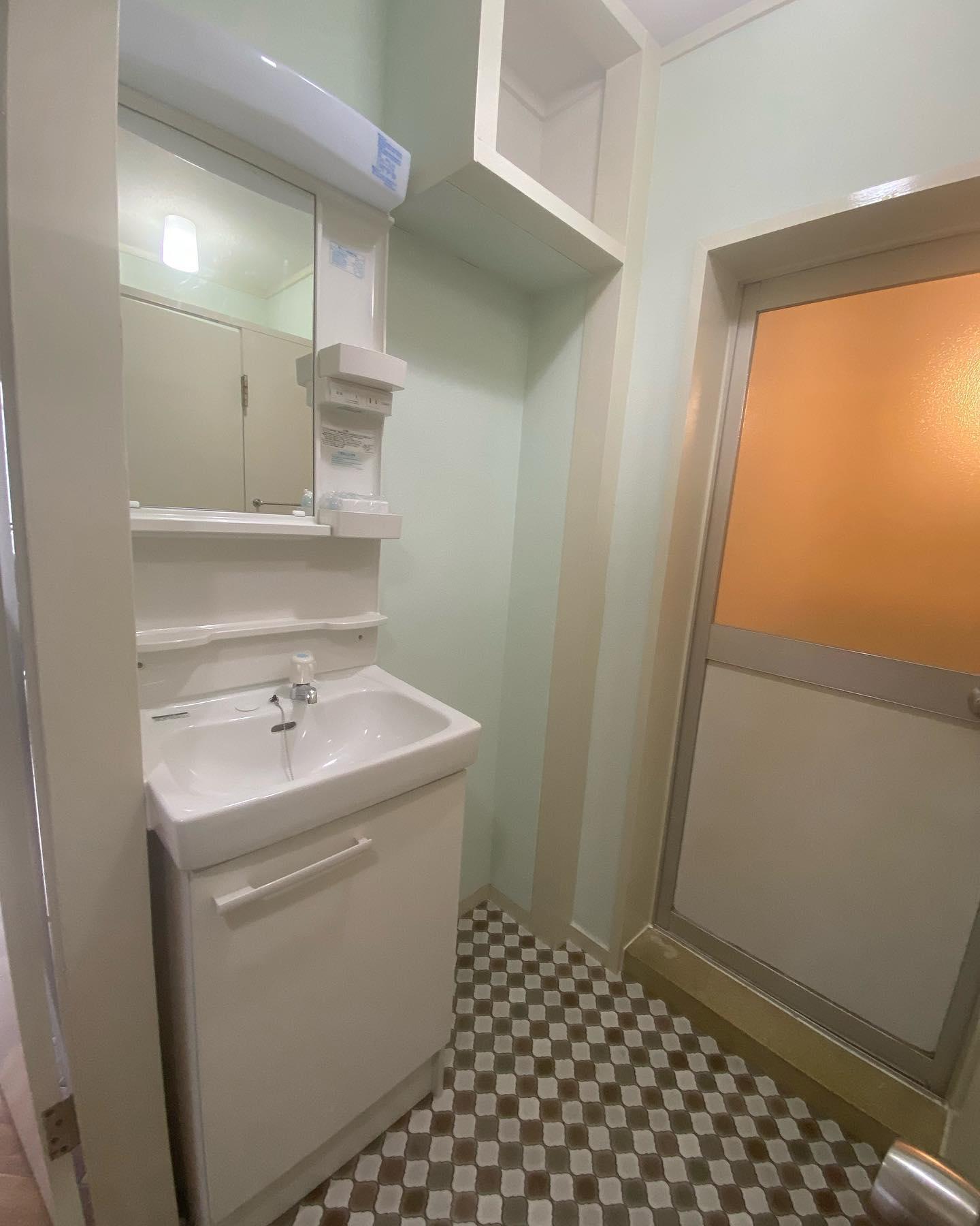 賃貸マンションリフォームLIXIL洗面オフトw500使用。昭和レトロ感を生かしつつ清潔で使いやすい洗面台に。 床は雰囲気に合うクッションフロアに張り替え、壁天井はパステルなグリーンに塗装。