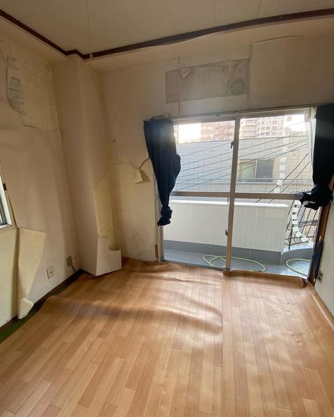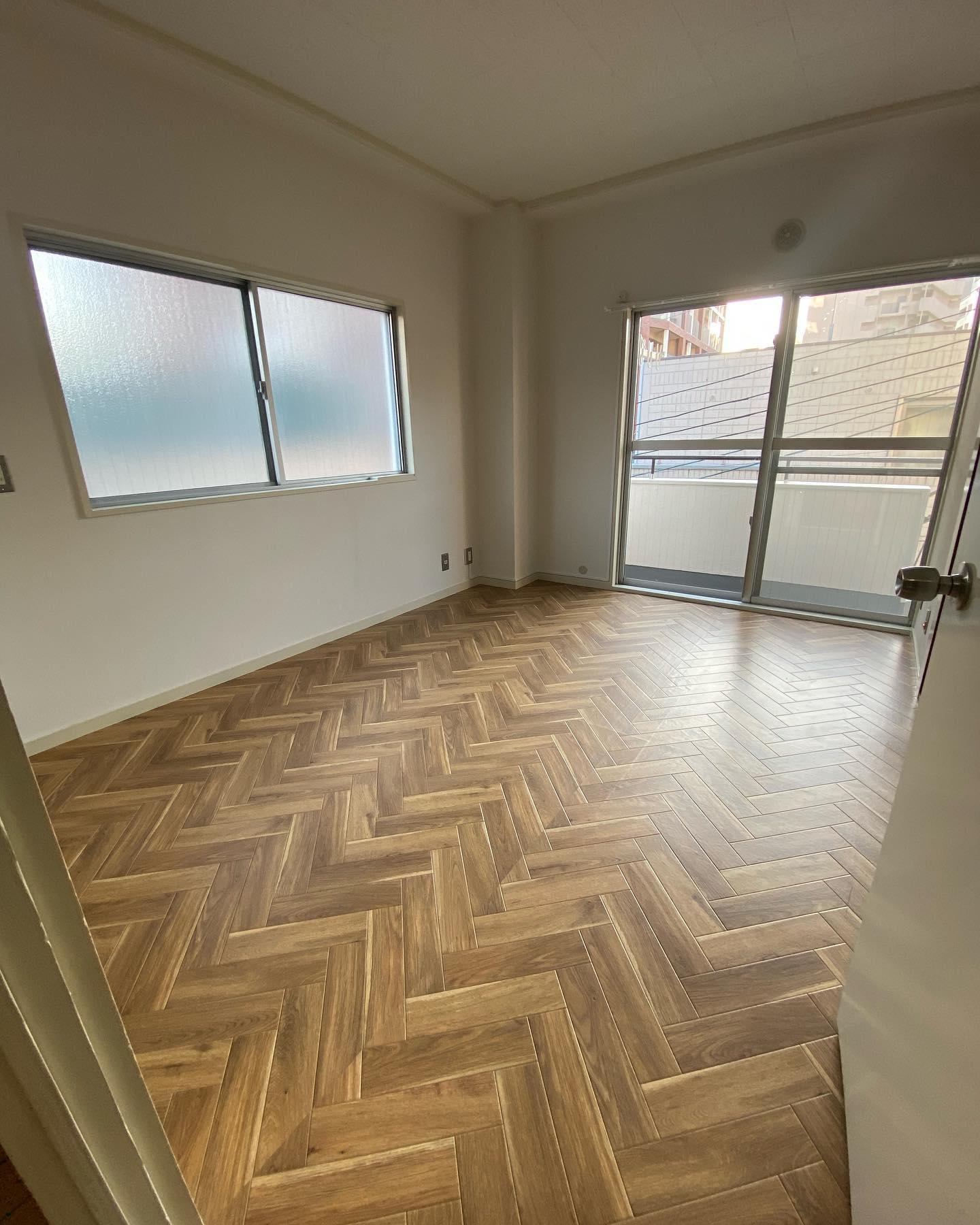 賃貸マンション全面リフォームに伴い、キッチンから続くリビングダイニングの内装も一新。 壁天井は塗装、ガラス割れ交換、クレセント交換。そしてヘリンボーンのクッションフロアがよく合います。