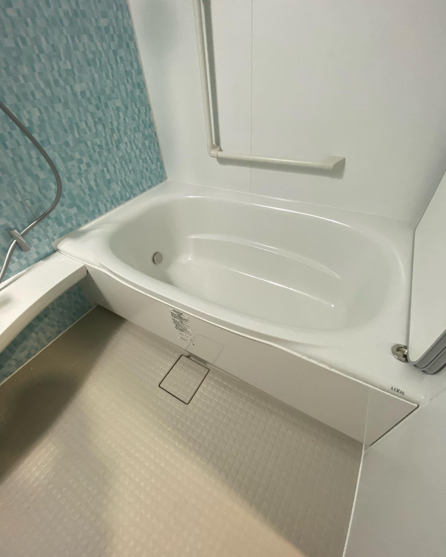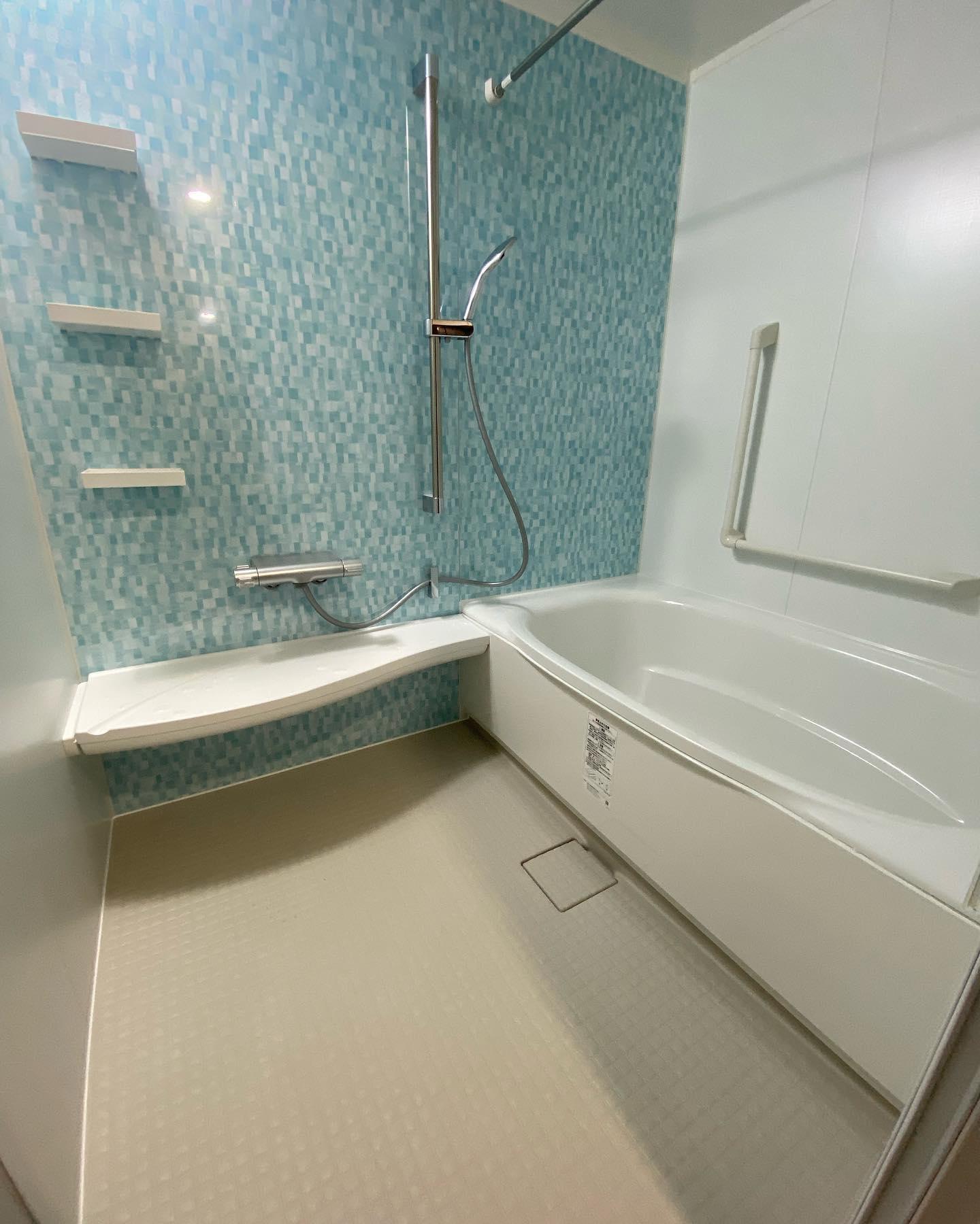 マンションの浴室リフォーム、LIXILリノビオV1418使用。 ゆったり広々した断熱浴槽、汚れにくい表面処理で掃除しやすい床... 爽やかなブルーのアクセントパネルも映える快適なお風呂に生まれ変わりました。 L字型手すり設置・入り口の段差も解消し安全性もアップ。
