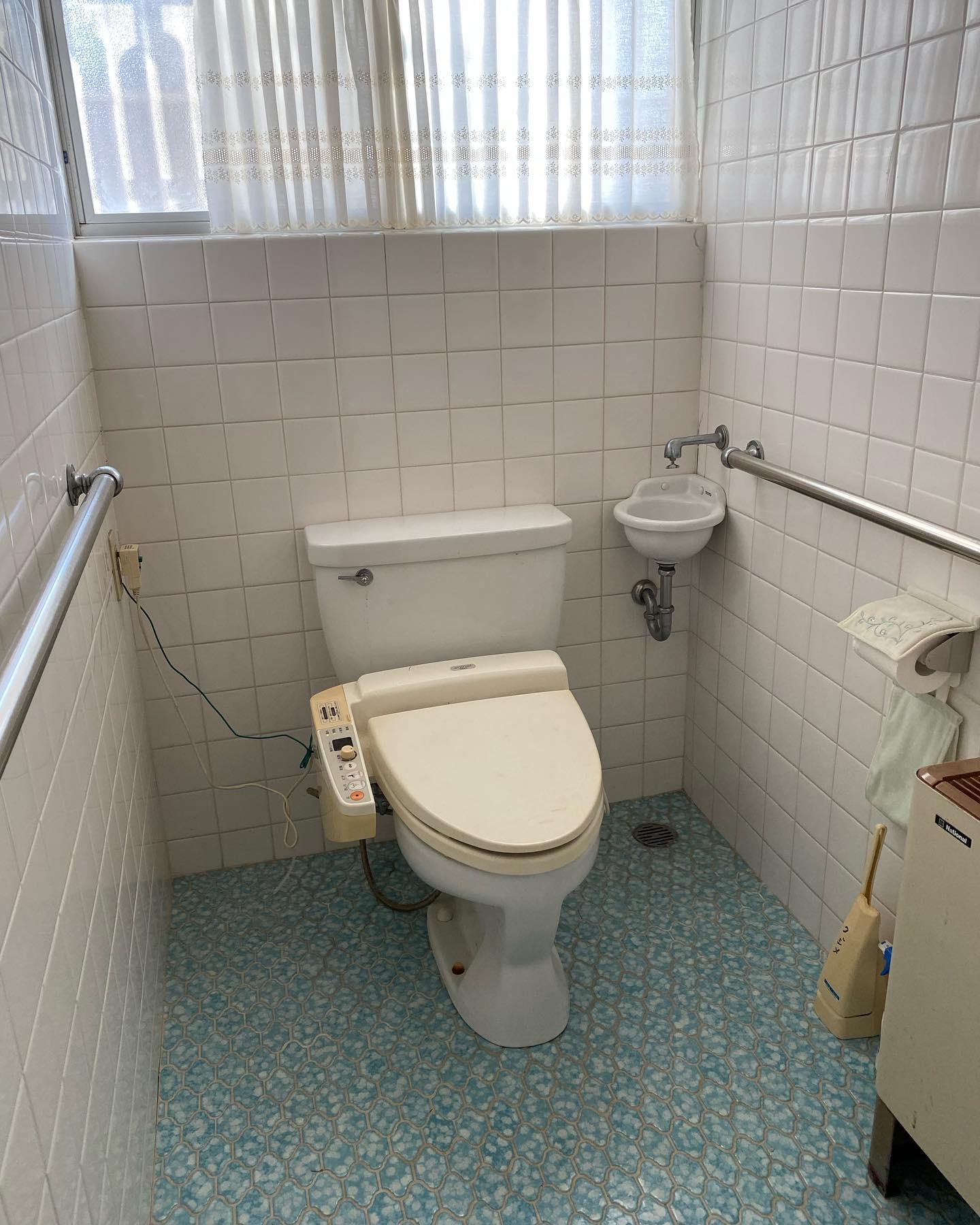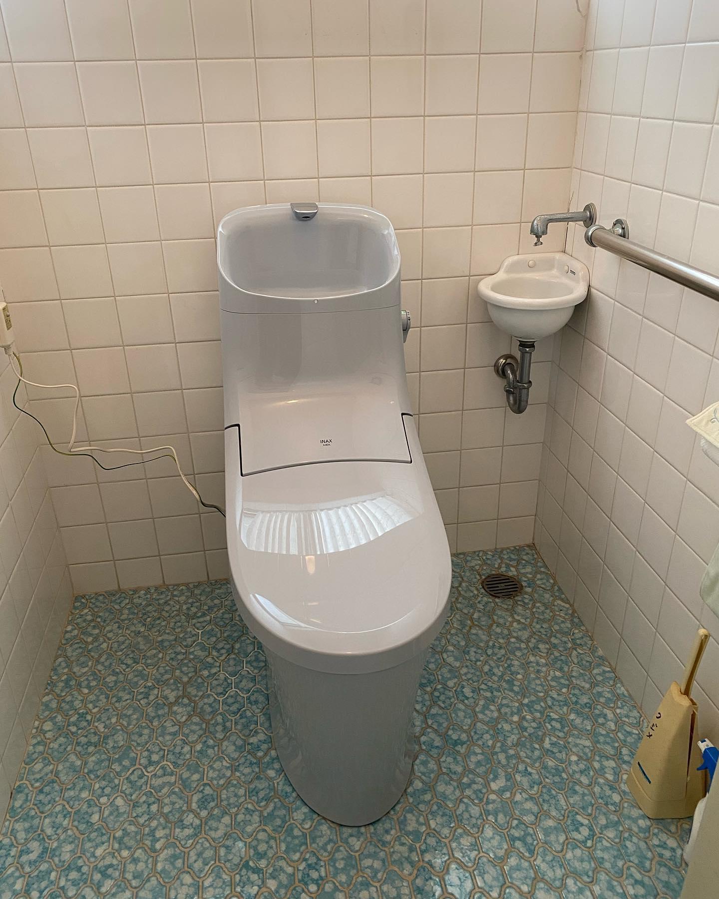戸建のトイレ交換(LIXILアメージュZAブルー) シャワートイレ一体型、便器から真上に持ち上がり 隙間汚れがしっかり拭き取れ、フチレス形状で便器の中も お掃除楽々。