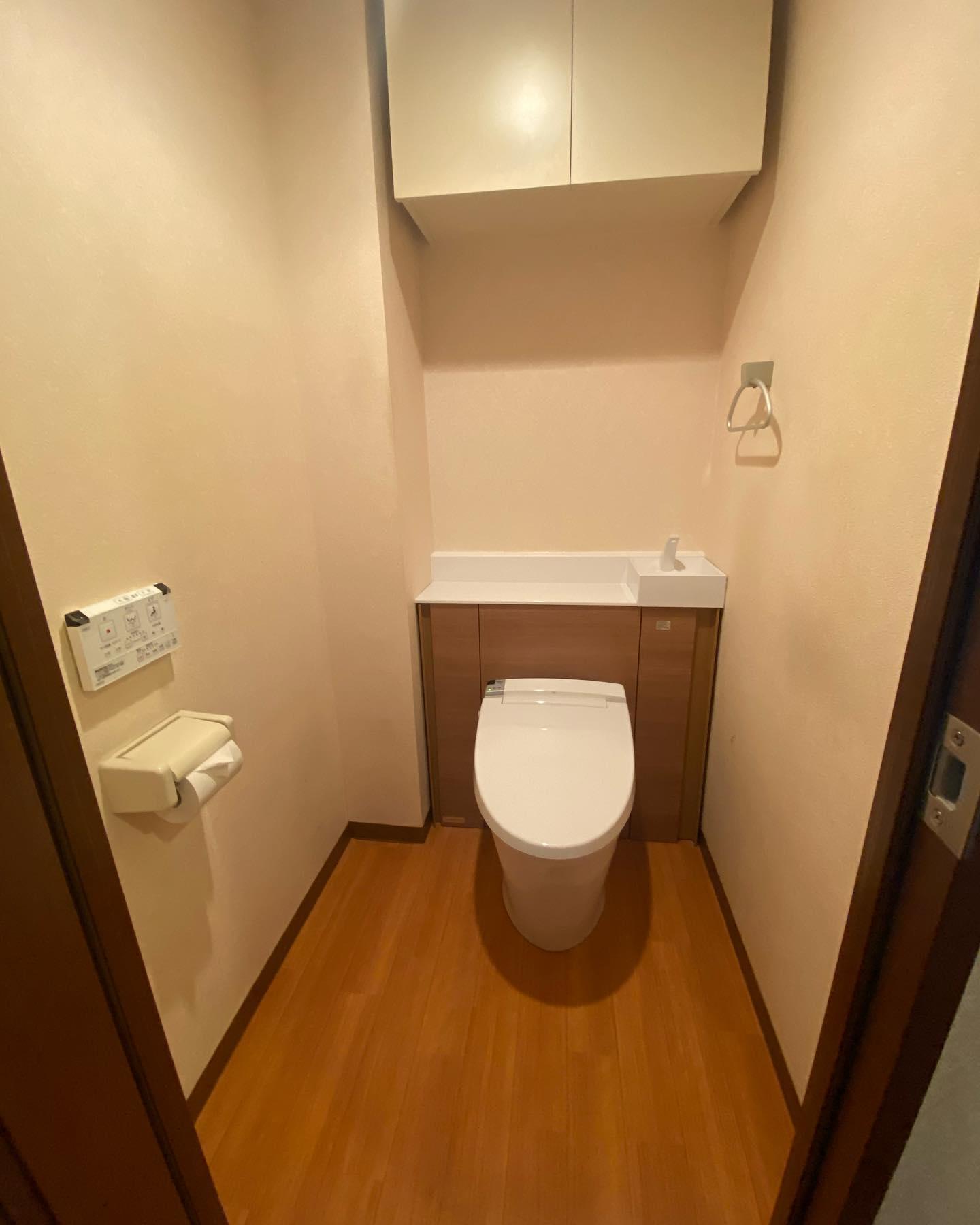 マンション、トイレ交換(LIXILリフォレ) タンクや排水管を隠してスッキリお掃除楽々。 クロスはそのまま使い、クッションフロアを張り替えました。 ソフト巾木交換とコンセント移設でさらにスッキリ。 半日のスピーディー工事。