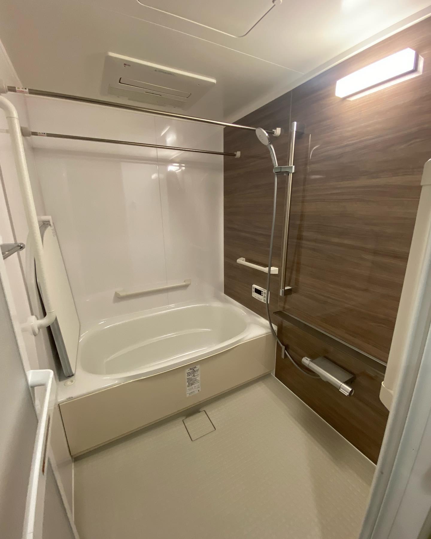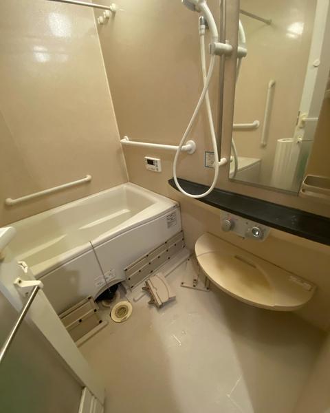 マンション、ユニットバス交換(LIXILリノビオV) カワック(浴室乾燥機)手摺り一部は再利用。 スリムカウンターは取り外してあらえます。 洗い場がひろびろ使えるようになりました。