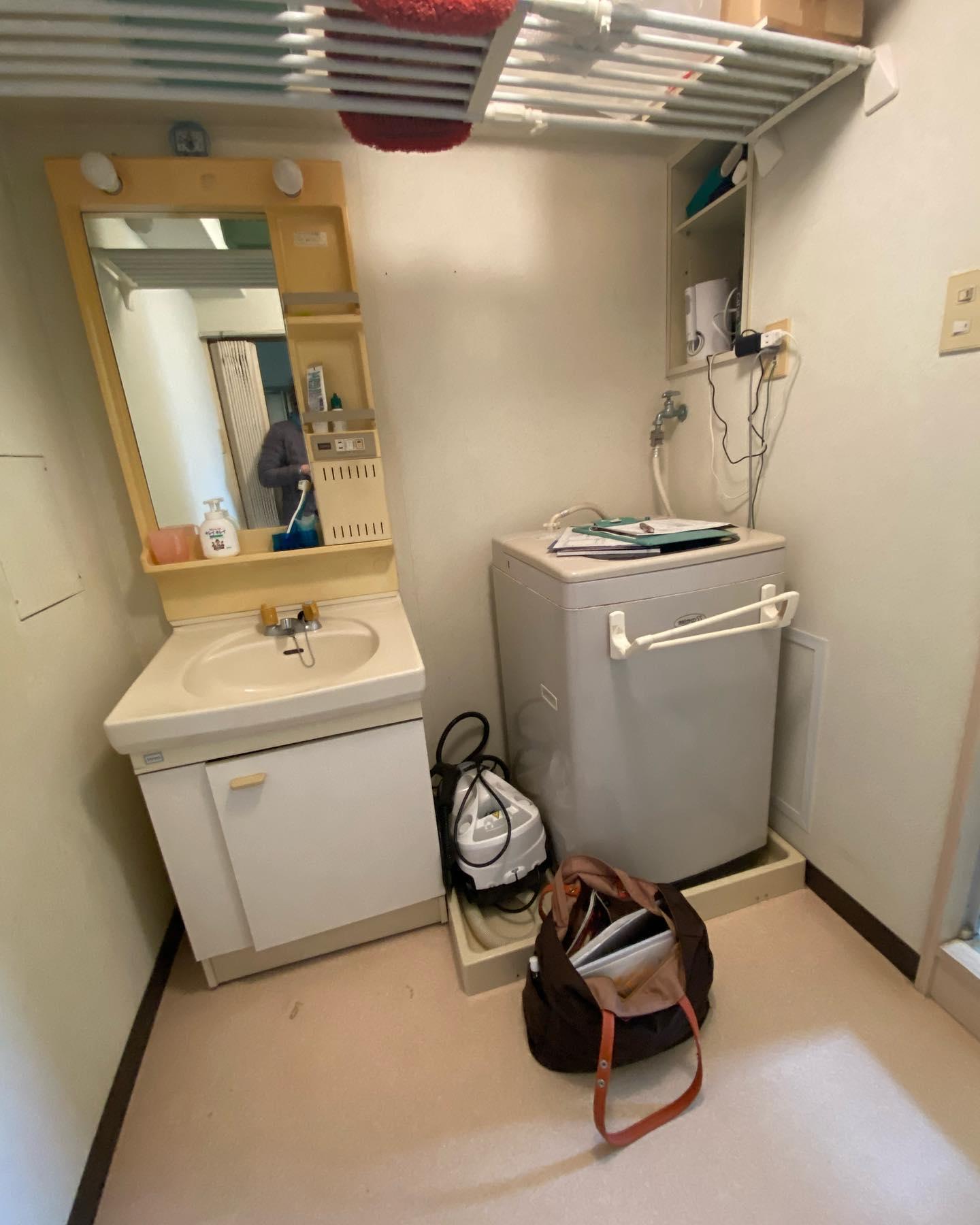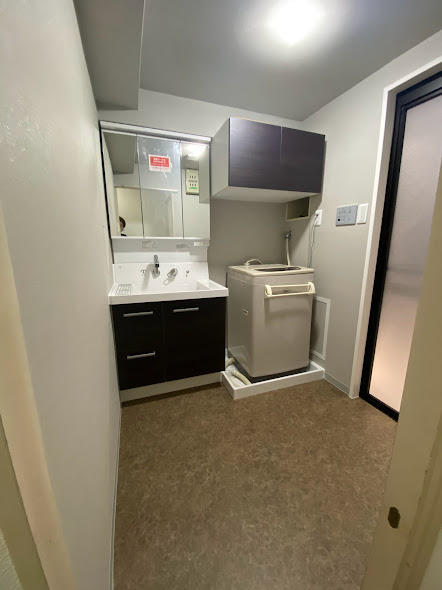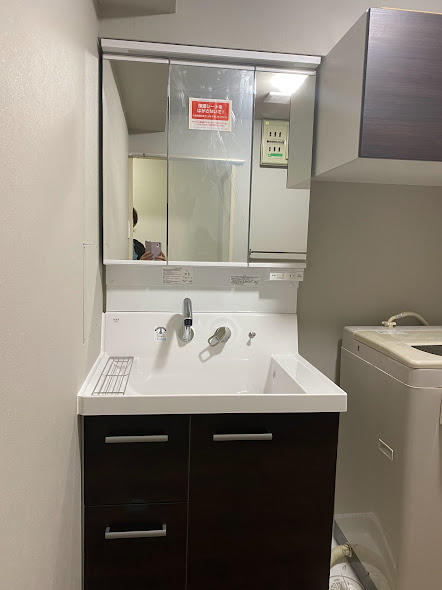 洗面台(LIXILピアラ750)高さアジャスタータイプ。 幅600から750にサイズアップ、ひろびろボールで 作業しやすく掃除も楽々。 洗濯機上にアッパーキャビネットを設置し、収納たっぷり。 壁天井のクロス、クッションフロアも貼り替えました。 洗濯パン・洗濯水栓ともに交換。