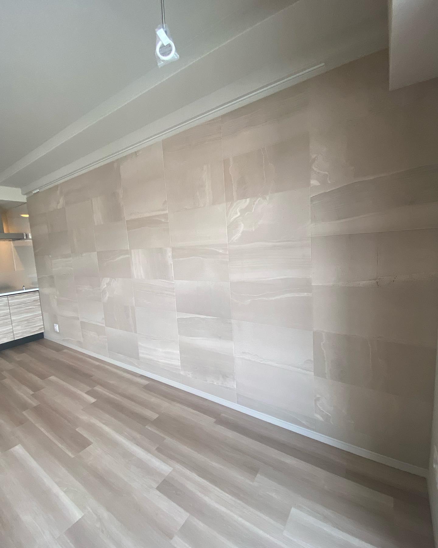 室内の湿気を調節してくれる、エコカラットプラス「ストーングレース」ベージュを壁面に施して快適リビング。湿気は通すが水や汚れはほぼ通さないため、水拭きも出来てキレイをキープ。気になる臭いの原因となる成分を吸着、脱臭します。