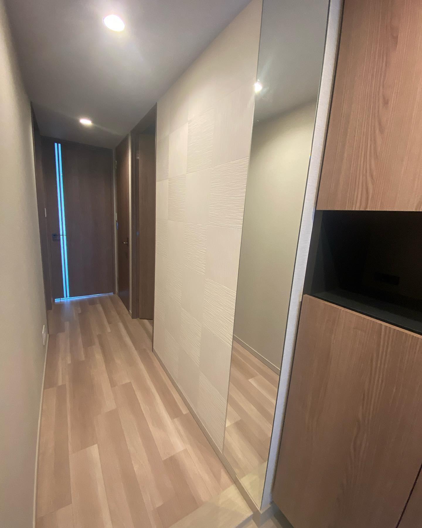 豊富なテクスチャーからエコカラットプラス「たけひご」ホワイトをチョイスし市松貼りにしました。落ち着いた中にデザイン性を感じる玄関前、全身ミラーと一緒に設置。玄関の気になる臭いにも調湿・脱臭機能が期待できます。