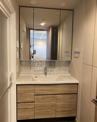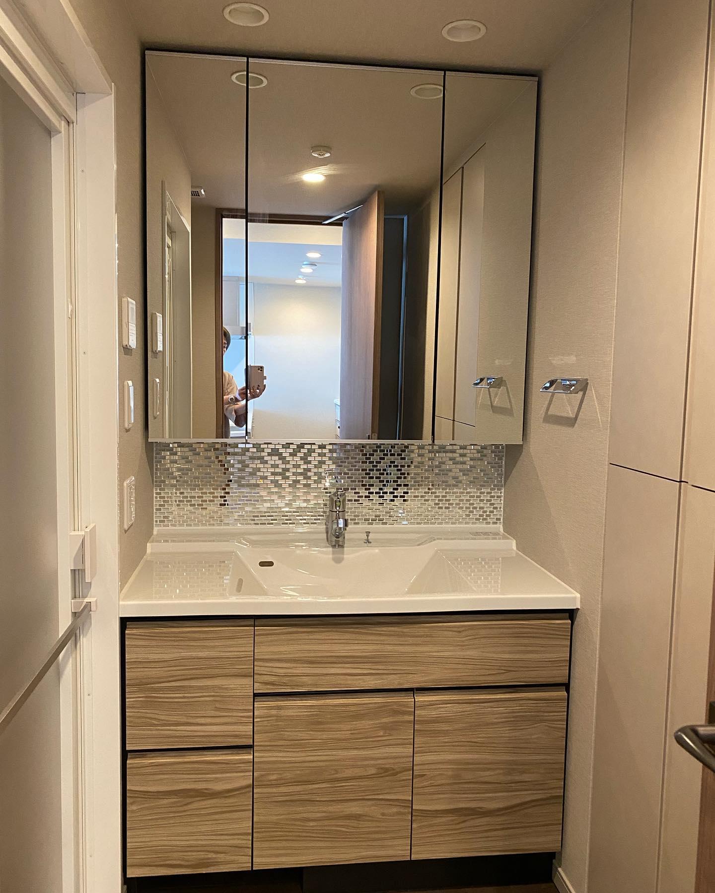新築マンションの洗面化粧台、水栓後ろにモザイクタイル(名古屋モザイク)を施しました。美しくおしゃれ、かつ水撥ねの汚れが一番目立つこの部分をカバーする効果も期待できます。
